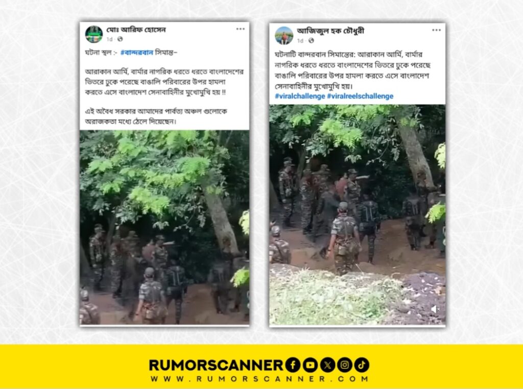 সম্প্রতি ‘ঘটনাটি বান্দরবান সিমান্তের: আরাকান আর্মি, বার্মার নাগরিক ধরতে ধরতে বাংলাদেশের ভিতরে ঢুকে পরেছে বাঙালি পরিবারের উপর হামলা করতে এসে বাংলাদেশ সেনাবাহিনীর মুখোমুখি হয়।’ ক্যাপশনে একটি ভিডিও সামাজিক যোগাযোগ মাধ্যমে প্রচার করা হয়েছে।