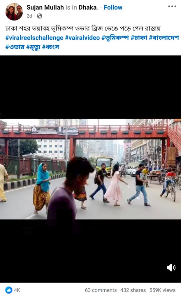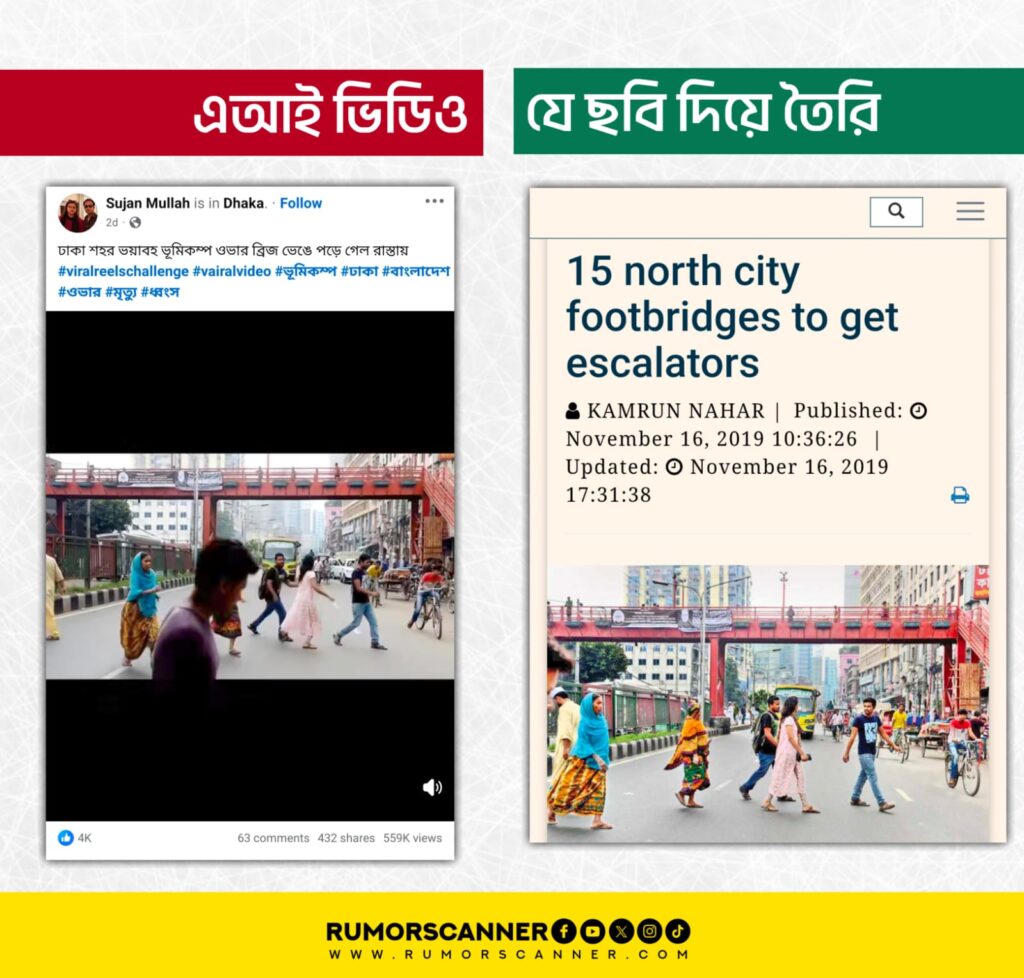 অর্থাৎ, একটি এআই দিয়ে তৈরি ভিডিওকে ঢাকার বিভিন্ন স্থানে উড়ালসেতু ভেঙে পড়ার দৃশ্য দাবিতে প্রচার করা হয়েছে।