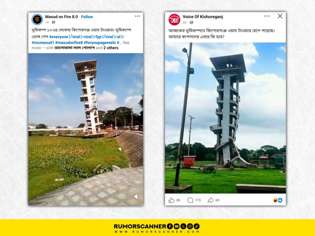 অর্থাৎ, এআই দিয়ে তৈরি ছবি ও ভিডিও ব্যবহার করে কিশোরগঞ্জের লোকসিটি ওয়াচ টাওয়ার ভেঙে পড়ার দাবি প্রচার করা হয়েছে।