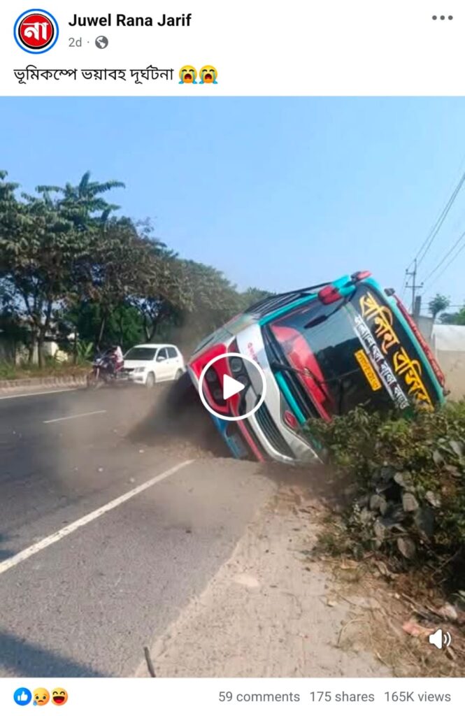 ভূমিকম্পের কারণে সড়ক দুর্ঘটনার দৃশ্য দাবিতে একটি ভিডিও ছড়িয়েছে ফেসবুকে। এতে দেখা যায় সড়কের ওপর একটি বাস এক পাশে হেলে পড়ছে।