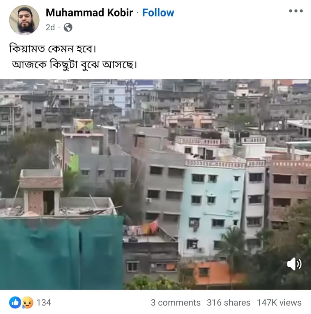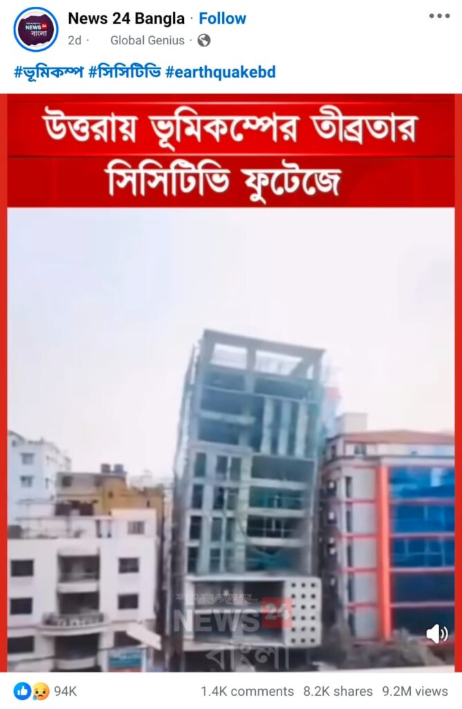 অর্থাৎ, এআই দিয়ে তৈরি একটি ভিডিওকে নরসিংদীতে ভূমিকম্পজনিত ভবন ধসের দৃশ্য দাবিতে প্রচার করা হয়েছে।