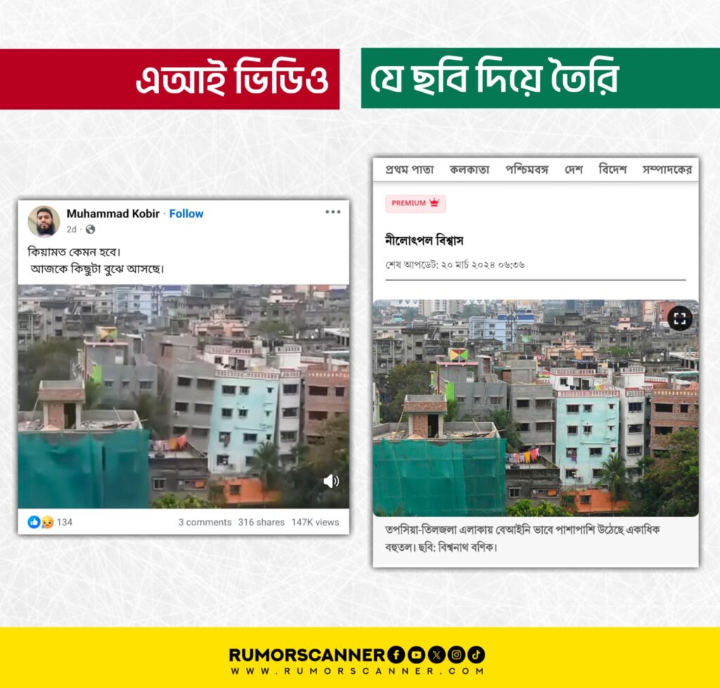 অনুসন্ধানে দেখা যায় ২০২৪ সালের ২০ মার্চ ভারতের আনন্দবাজার পত্রিকার ওয়েবসাইটে প্রকাশিত একটি ছবির সঙ্গে আলোচিত ভিডিওটির মিল রয়েছে। ছবির ক্যাপশন অনুযায়ী স্থানটি তপসিয়া তিলজলা এলাকা, যা ভারতের পশ্চিমবঙ্গে অবস্থিত। ভিডিও পর্যবেক্ষণেও অস্বাভাবিক দুলুনি ও বিভিন্ন ভিজ্যুয়াল অসংগতি পাওয়া যায়।