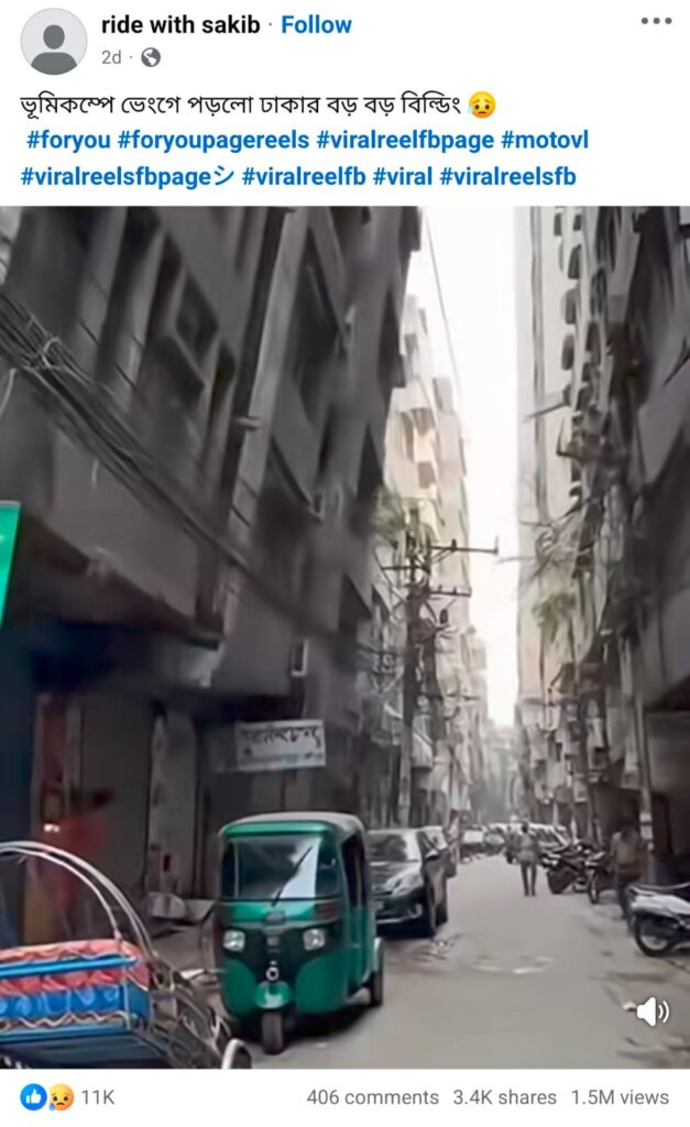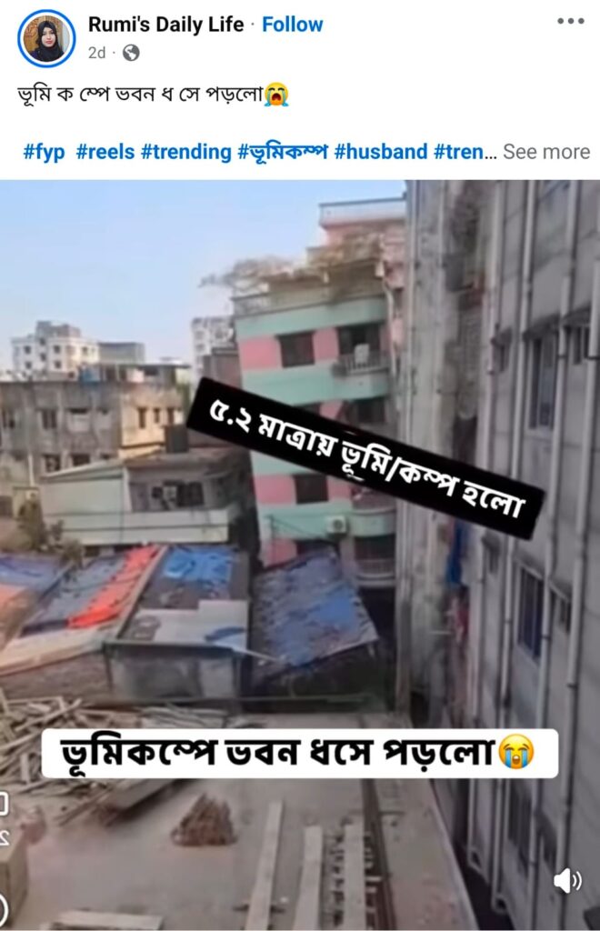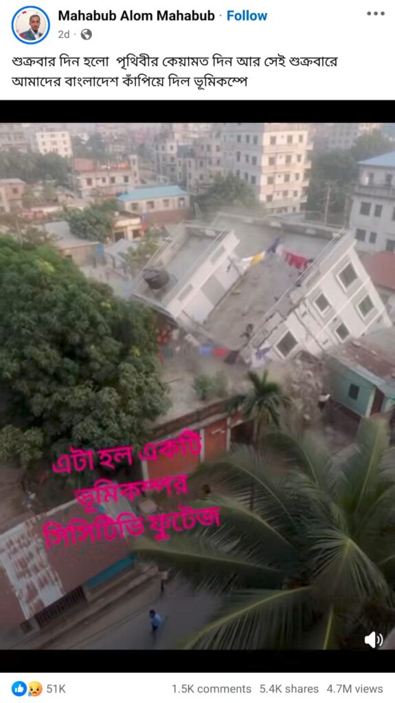 ভূমিকম্পে ভবন ভেঙে পড়ার সিসিটিভি ফুটেজ দাবিতে একটি ভিডিও সামাজিক মাধ্যমে ছড়িয়েছে। কিছু পোস্টে এটিকে নরসিংদীর ঘটনা দাবি করা হয়েছে। ভিডিওটি ছড়িয়েছে ফেসবুক, ইন্সটাগ্রাম ও টিকটকে।