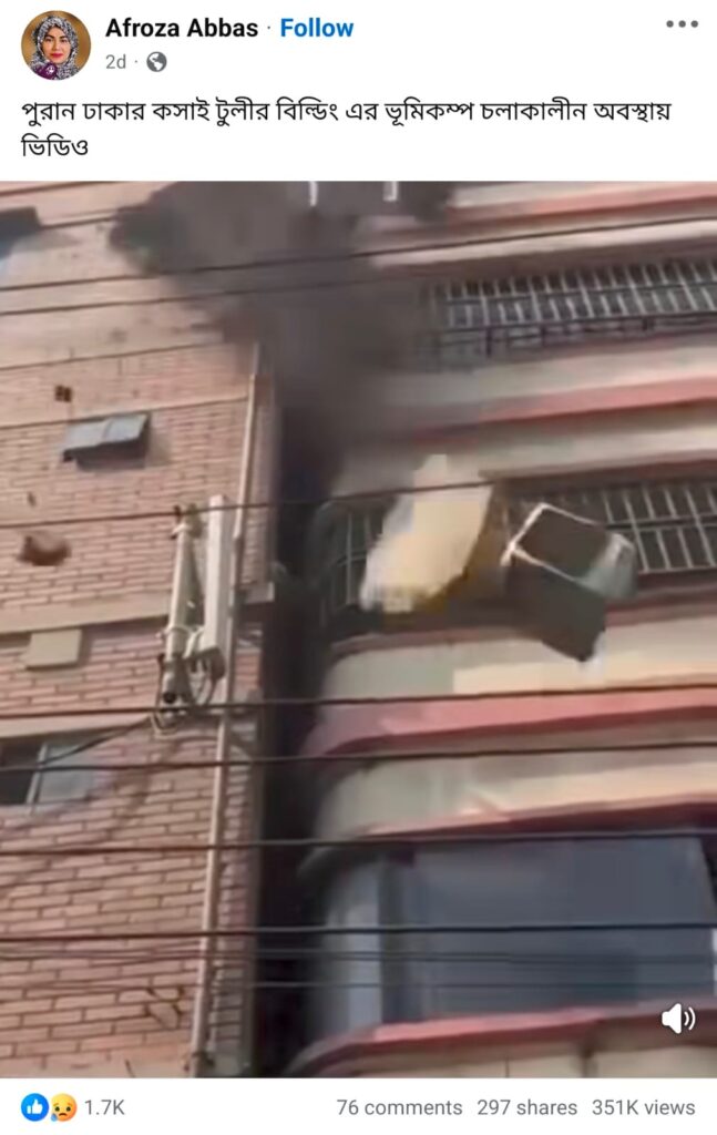 ভূমিকম্পের সময় পুরান ঢাকার কসাই টুলীর ভবনের অবস্থা দাবিতে একটি ভিডিও ছড়িয়েছে ফেসবুকে। ইউটিউবে এটিকে নরসিংদীর ঘটনা দাবি করা হয়েছে। এতে পাশাপাশি থাকা দুইটি ভবনের কিছু অংশ ভেঙে পড়তে দেখা যায়।