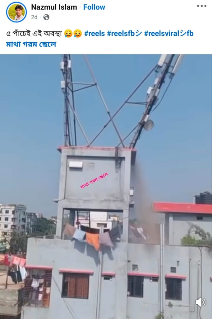 অনুসন্ধানে এমন কোনো টাওয়ার ভাঙার তথ্য পাওয়া যায়নি। ভিডিওটি পর্যবেক্ষণেও অসংগতি ধরা পড়ে। শুরুতে টাওয়ারের সামনে ঝুলে থাকা দড়িতে চারটি কাপড় দেখা যায়, কিন্তু পরের অংশে দড়িটি নিচে নেমে গেলে কাপড়ের সংখ্যা পাঁচটি হয়ে যায়। বাস্তব ভিডিওতে এমন পরিবর্তন স্বাভাবিক নয়।