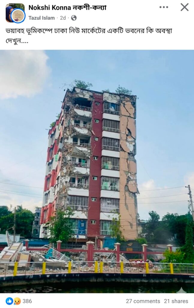ভূমিকম্পে ঢাকার নিউ মার্কেটের একটি ভবনের অবস্থা দাবিতে একটি ছবি সামাজিক মাধ্যমে ছড়িয়েছে। ছবিতে ভবনের বেশ কিছু অংশ ভেঙে পড়া দেখা যায়। এটি ছড়িয়েছে ফেসবুক, ইউটিউব, টিকটকে।