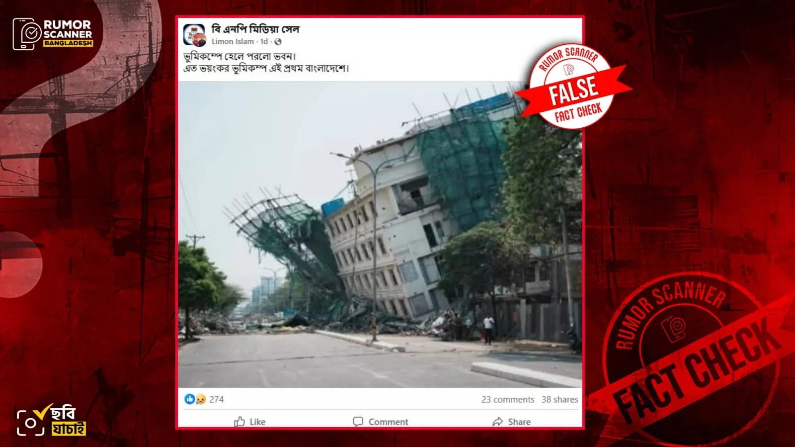 রিউমর স্ক্যানার টিমের অনুসন্ধানে জানা যায়, প্রচারিত ছবিটি ২১ নভেম্বর বাংলাদেশে আঘাত হানা ভূমিকম্পে ক্ষয়ক্ষতির কোনো দৃশ্যের নয় বরং, চলতি বছরের ২ এপ্রিল মায়ানমারে আঘাত হানা ভূমিকম্পে ধসে পড়া ভবনের দৃশ্যকে আলোচিত দাবিতে প্রচার করা হয়েছে।