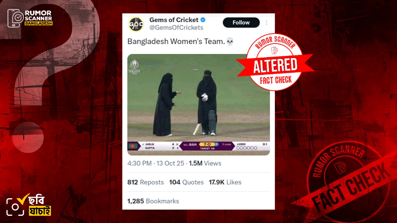 ভারতের গুয়াহাটিতে চলমান নারীদের ওয়ানডে ক্রিকেট বিশ্বকাপে গত ১০ অক্টোবরে নিউজিল্যান্ড নারী ক্রিকেট দলের মুখোমুখি হয় বাংলাদেশ নারী ক্রিকেট দল। নিউজিল্যান্ডের দেওয়া ২২৮ রানের টার্গেটে ব্যাট করতে নেমে ১২৭ রানে গুটিয়ে যায় বাংলাদেশের ইনিংস। এরই প্রেক্ষিতে উক্ত ম্যাচের কথিত একটি স্ক্রিনশট সম্প্রতি অনলাইনে প্রচার করা হয়েছে যেখানে দেখা যায় বাংলাদেশ নারী দলের ক্রিকেটার ঝিলিক ও সুপ্তা বোরকা পরে ব্যাটিং করছেন। ছবিটি প্রচার করে দাবি করা হয়েছে, বাংলাদেশ নারী দলের ক্রিকেটার নিউজিল্যান্ডের সাথে ম্যাচে বোরকা পরে খেলেছিলেন।