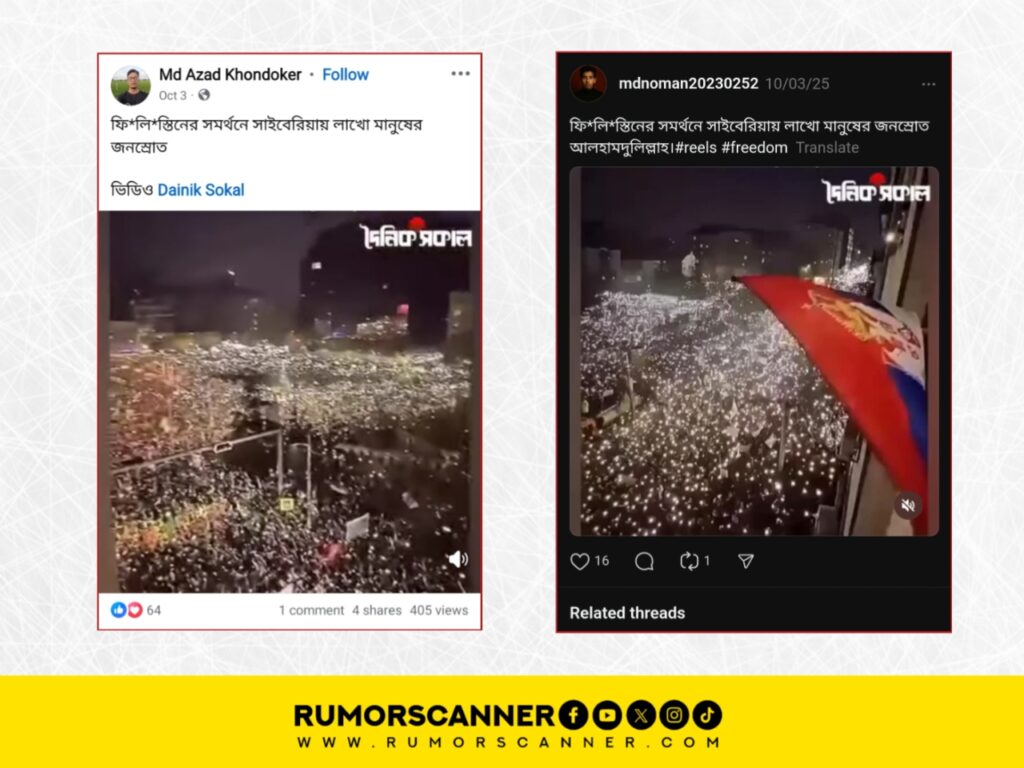 সম্প্রতি, “ফি*লি*স্তিনের সমর্থনে সাইবেরিয়ায় লাখো মানুষের জনস্রোত” শিরোনামে একটি ভিডিও সামাজিক যোগাযোগ মাধ্যমে প্রচার করা হয়েছে।