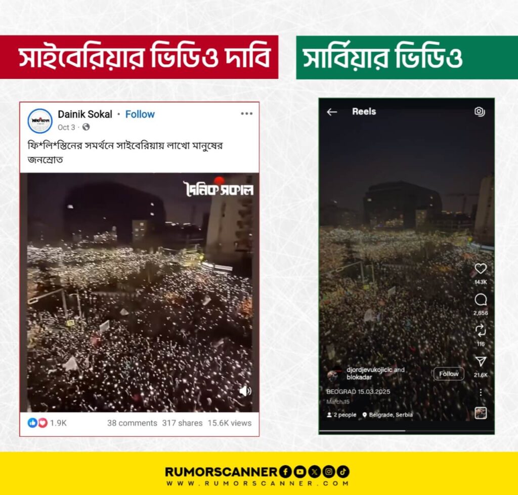 রিউমর স্ক্যানার টিমের অনুসন্ধানে জানা যায়, প্রচারিত ভিডিওটি সাইবেরিয়ার নয়। প্রকৃতপক্ষে, সার্বিয়ার শহর বেলগ্রেডে সরকারি দুর্নীতি বিরোধী বিক্ষোভের দৃশ্যকে আলোচিত দাবিতে প্রচার করা হয়েছে।