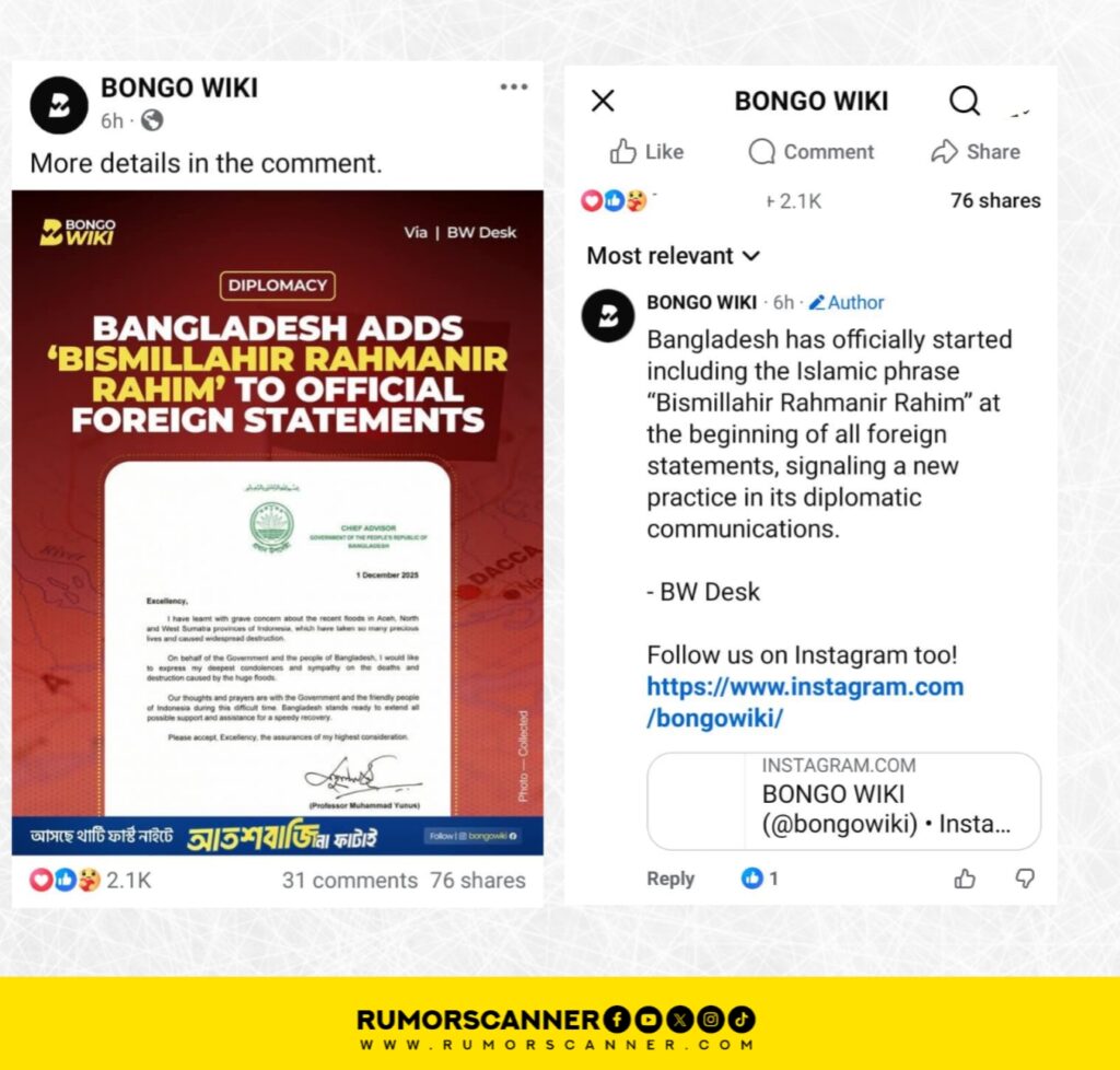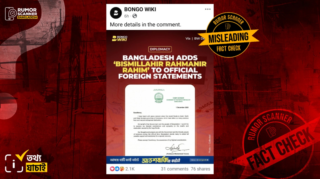 ইন্দোনেশিয়ার আচেহ, উত্তর সুমাত্রা ও পশ্চিম সুমাত্রা প্রদেশে সাম্প্রতিক ভয়াবহ বন্যায় অনেক মানুষের প্রাণহানি ও ব্যাপক ক্ষয়ক্ষতির ঘটনায় গভীর শোক প্রকাশ করেছেন বাংলাদেশের অন্তর্বর্তী সরকারের প্রধান উপদেষ্টা প্রফেসর মুহাম্মদ ইউনূস। তিনি ০১ ডিসেম্বর ইন্দোনেশিয়ার প্রেসিডেন্ট প্রাবোও সুবিয়ান্তোকে পাঠানো এক বার্তায় এই শোক ও সমবেদনা জানান। এরই প্রেক্ষিতে উক্ত শোক বার্তার ছবি প্রচার করে সামাজিক যোগাযোগ মাধ্যমের কিছু পোস্টে দাবি করা হচ্ছে, বাংলাদেশ আনুষ্ঠানিকভাবে অফিশিয়াল ফরেন স্টেটমেন্টের শুরুতে ‘বিসমিল্লাহির রাহমানির রাহিম’ লেখা শুরু করেছে।