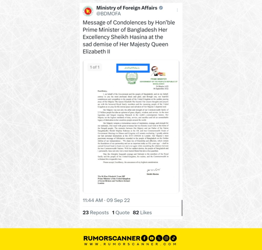এ বিষয়ে অনুসন্ধানে ২০২২ সালের ০৯ সেপ্টেম্বর বাংলাদেশের পররাষ্ট্র মন্ত্রণালয়ের এক্স অ্যাকাউন্টে তৎকালীন প্রধানমন্ত্রী শেখ হাসিনার একটি ফরেন স্টেটমেন্ট খুঁজে পাওয়া যায়। এই স্টেটমেন্টের শুরুতে ‘বিসমিল্লাহির রাহমানির রাহিম’ লেখা ছিল। যুক্তরাজ্যের তৎকালীন প্রধানমন্ত্রী লিজ ট্রাসকে পাঠানো এই বার্তায় রানি দ্বিতীয় এলিজাবেথের মৃত্যুতে গভীর শোক ও দুঃখ প্রকাশের কথা জানান শেখ হাসিনা।