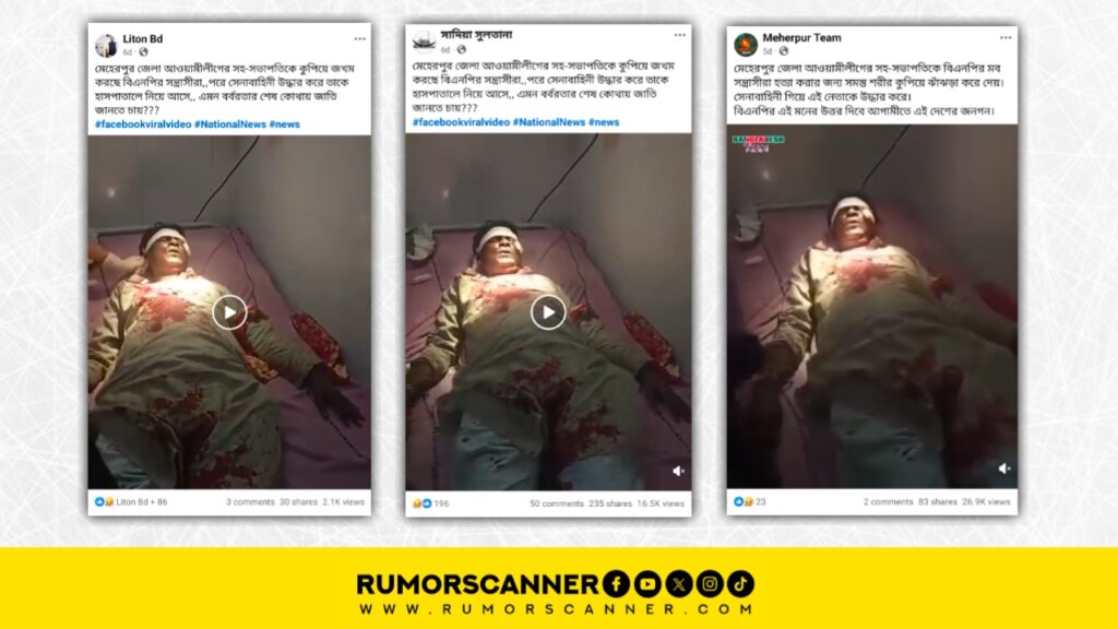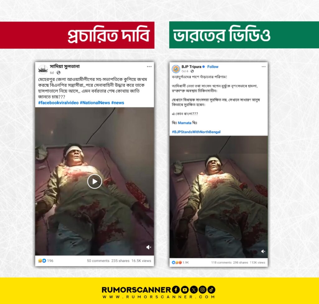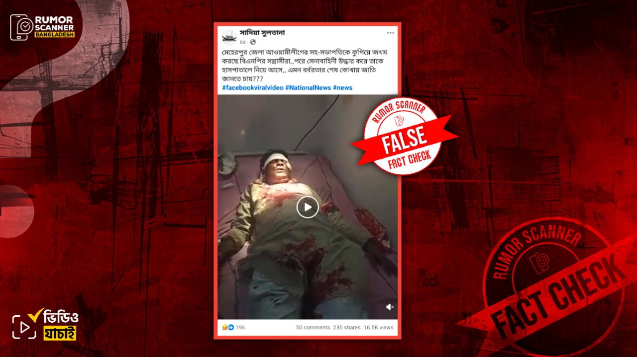 রিউমর স্ক্যানার টিমের অনুসন্ধানে দেখা যায়, মেহেরপুর জেলা আওয়ামী লীগের সহ-সভাপতিকে বিএনপির নেতাকর্মীদের কুপিয়ে জখম করেছে শীর্ষক দাবিটি সঠিক নয়। প্রকৃতপক্ষে, ভারতের ত্রিপুরা রাজ্যের বিজেপির আদিবাসী নেতা ও সংসদ সদস্য খগেন মুর্মুকে মারধরের ঘটনার ভিডিওকে আলোচিত দাবিতে প্রচার করা হয়েছে।