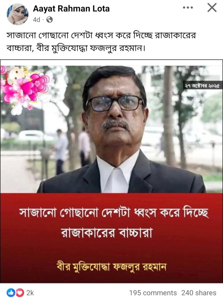 সম্প্রতি, ‘সাজানো গোছানো দেশটা ধ্বংস করে দিচ্ছে রাজাকারের বাচ্চারা’ শীর্ষক মন্তব্যটি পদ স্থগিত হওয়া বিএনপির চেয়ারপারসনের উপদেষ্টা অ্যাডভোকেট ফজলুর রহমান করেছেন দাবিতে সামাজিক যোগাযোগ মাধ্যমে প্রচার করা হয়েছে।