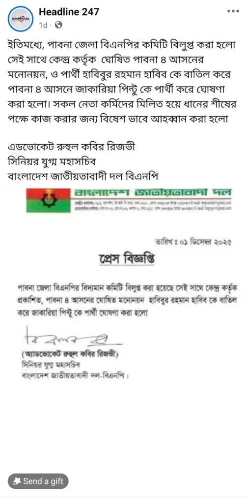 পাবনা-৪ (ঈশ্বরদী-আটঘরিয়া) আসনে বিএনপির চেয়ারপার্সনের উপদেষ্টা ও পাবনা জেলা বিএনপির আহ্বায়ক হাবিবুর রহমান হাবিবের মনোনয়ন বাতিল করে ঈশ্বরদী জেলা বিএনপির সাবেক যুগ্ম সম্পাদক জাকারিয়া পিন্টুকে ধানের শীষের প্রার্থী করার দাবিতে লাগাতার কর্মসূচি পালন করছেন বিক্ষুব্ধ নেতাকর্মীরা। এরই প্রেক্ষিতে সম্প্রতি ‘পাবনা জেলা বিএনপির বিদ্যমান কমিটি বিলুপ্ত করা হয়েছে সেই সাথে কেন্দ্র কর্তৃক প্রকাশিত, পাবনা-৪ আসনের ঘোষিত মনোনয়ন হাবিবুর রহমান হাবিব কে বাতিল করে জাকারিয়া পিন্টু কে পার্থী ঘোষণা করা হলো’ শীর্ষক শিরোনামে বাংলাদেশ জাতীয়তাবাদী দল-বিএনপির সিনিয়র যুগ্ম মহাসচিব এ্যাডভোকেট রুহুল কবির রিজভী স্বাক্ষরিত একটি প্রেস বিজ্ঞপ্তির ছবি সামাজিক যোগাযোগ মাধ্যমে প্রচার করা হয়েছে।