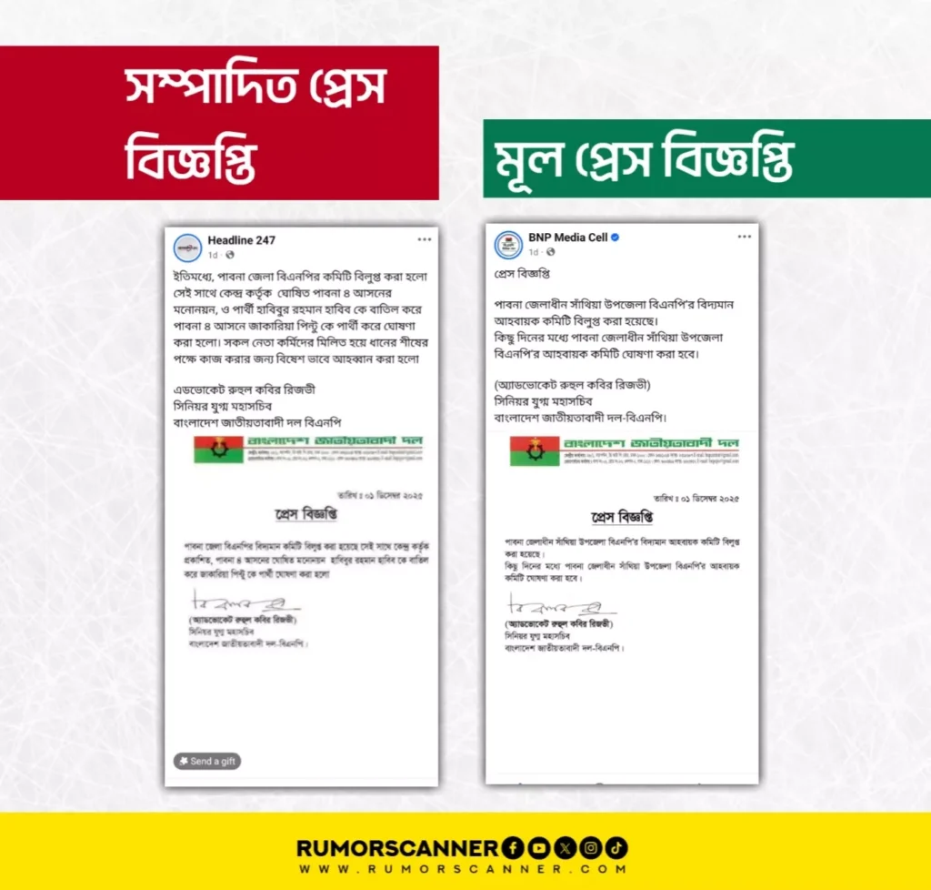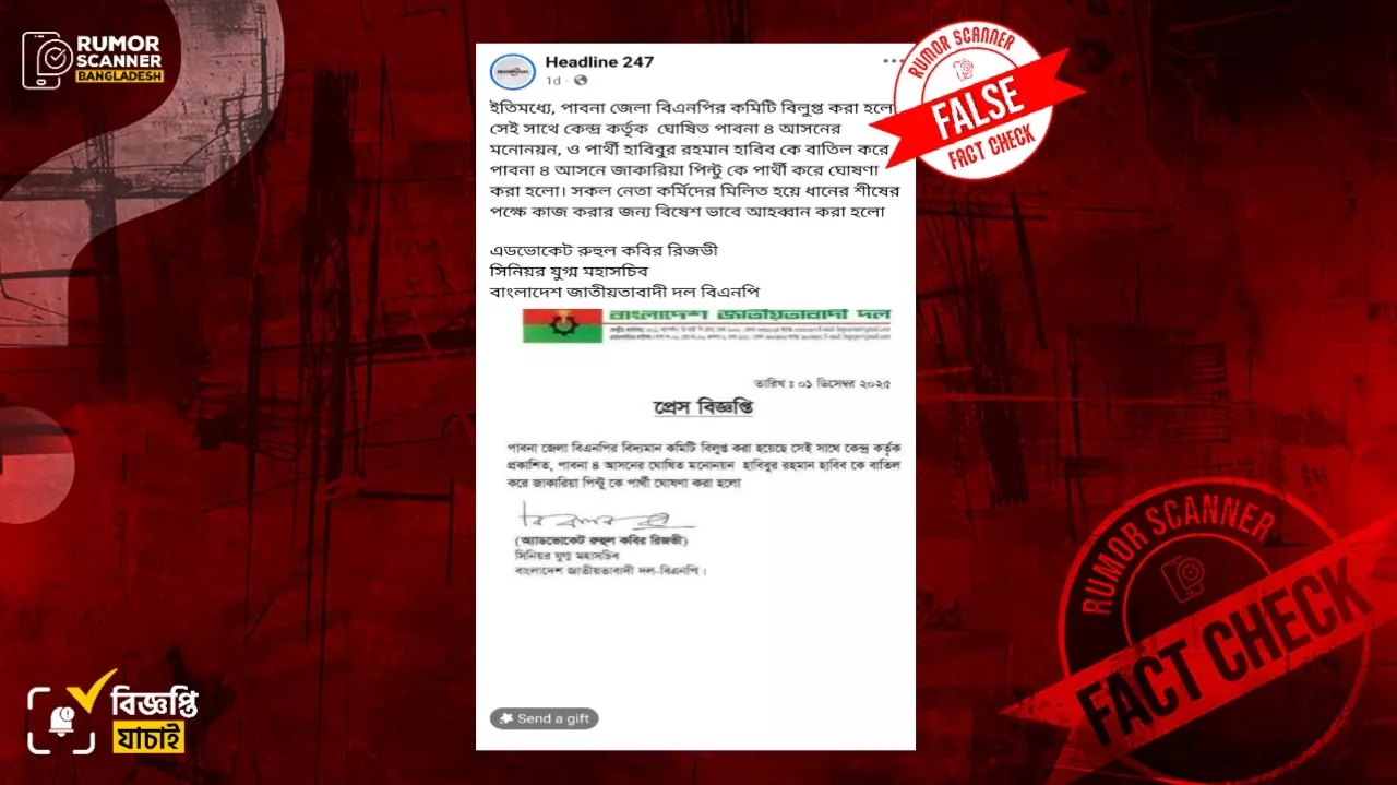 রিউমর স্ক্যানার টিমের অনুসন্ধানে জানা যায়, পাবনা-৪ আসনে পূর্ব ঘোষিত মনোনয়ন বাতিল করে নতুন প্রার্থী ঘোষণার বিষয়ে বিএনপি কোনো প্রেস বিজ্ঞপ্তি প্রকাশ করেনি। প্রকৃতপক্ষে, দলের অন্য একটি প্রেস বিজ্ঞপ্তি সম্পাদনা করে আলোচিত ভুয়া প্রেস বিজ্ঞপ্তিটি তৈরি করা হয়েছে।