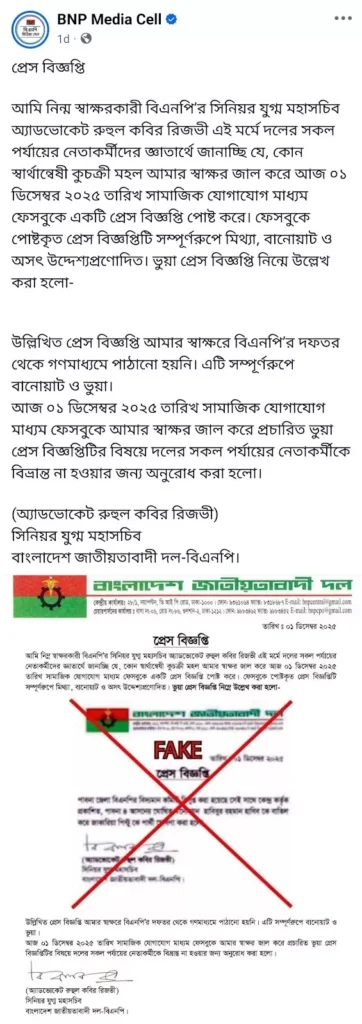 এছাড়া, বিএনপির মিডিয়া সেলের ফেসবুক পেজে গত ০১ ডিসেম্বর প্রকাশিত পোস্টে একটি প্রেস বিজ্ঞপ্তিটির ছবি সংযুক্ত করা হয়। বিএনপির সিনিয়র যুগ্ম মহাসচিব অ্যাডভোকেট রুহুল কবির রিজভীর স্বাক্ষর যুক্ত উক্ত প্রেস বিজ্ঞপ্তিতে আলোচিত প্রেস বিজ্ঞপ্তিটি ছবি যুক্ত করে বলা হয়, ‘কোন স্বার্থান্বেষী কুচক্রী মহল আমার স্বাক্ষর জাল করে আজ ০১ ডিসেম্বর ২০২৫ তারিখ সামাজিক যোগাযোগ মাধ্যম ফেসবুকে একটি প্রেস বিজ্ঞপ্তি পোষ্ট করে। ফেসবুকে পোষ্টকৃত প্রেস বিজ্ঞপ্তিটি সম্পূর্ণরুপে মিথ্যা, বানোয়াট ও অসৎ উদ্দেশ্যপ্রণোদিত। উল্লিখিত প্রেস বিজ্ঞপ্তি আমার স্বাক্ষরে বিএনপি’র দফতর থেকে গণমাধ্যমে পাঠানো হয়নি। এটি সম্পূর্ণরুপে বানোয়াট ও ভুয়া। আজ ০১ ডিসেম্বর ২০২৫ তারিখ সামাজিক যোগাযোগ মাধ্যম ফেসবুকে আমার স্বাক্ষর জাল করে প্রচারিত ভুয়া প্রেস বিজ্ঞপ্তিটির বিষয়ে দলের সকল পর্যায়ের নেতাকর্মীকে বিভ্রান্ত না হওয়ার জন্য অনুরোধ করা হলো।’।