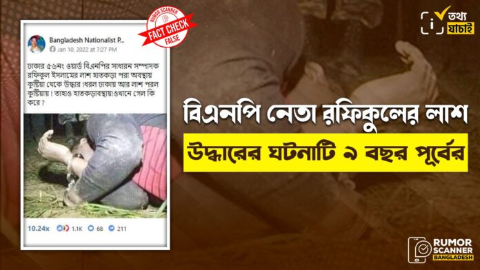 রিউমর স্ক্যানার টিমের অনুসন্ধানে দেখা যায়, হাতকড়া পরা অবস্থায় ঢাকার ৫৬ নং ওয়ার্ড বিএনপির সাধারণ সম্পাদক রফিকুল ইসলামের লাশ উদ্ধারের ঘটনাটি সাম্প্রতিক সময়ের নয় বরং এটি ৯ বছর পূর্বের ঘটনা।