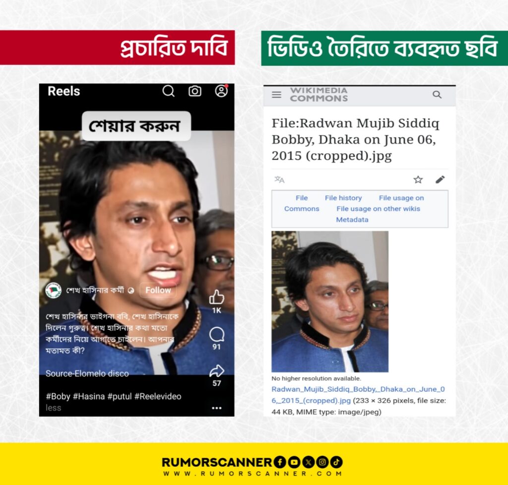 তাছাড়া, রিভার্স ইমেজ সার্চ করে দেখা যায়, উইকিপিডিয়াতে থাকা রাদওয়ান মুজিব সিদ্দিক ববির ২০১৫ সালের ছবির সাথে আলোচিত ভিডিওর সাদৃশ্য রয়েছে।