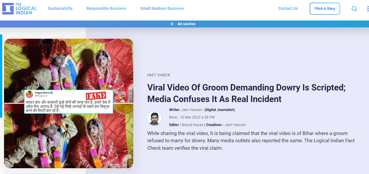 পরবর্তীতে, Vikram Mishra নামটি সার্চ করে newsmobile.in-এ “Fact Check: Staged Video of a Bride Running Off with Lover Shared as Real” শীর্ষক শিরোনামে একটি ফ্যাক্ট চেক প্রতিবেদন খুঁজে পাওয়া যায়।