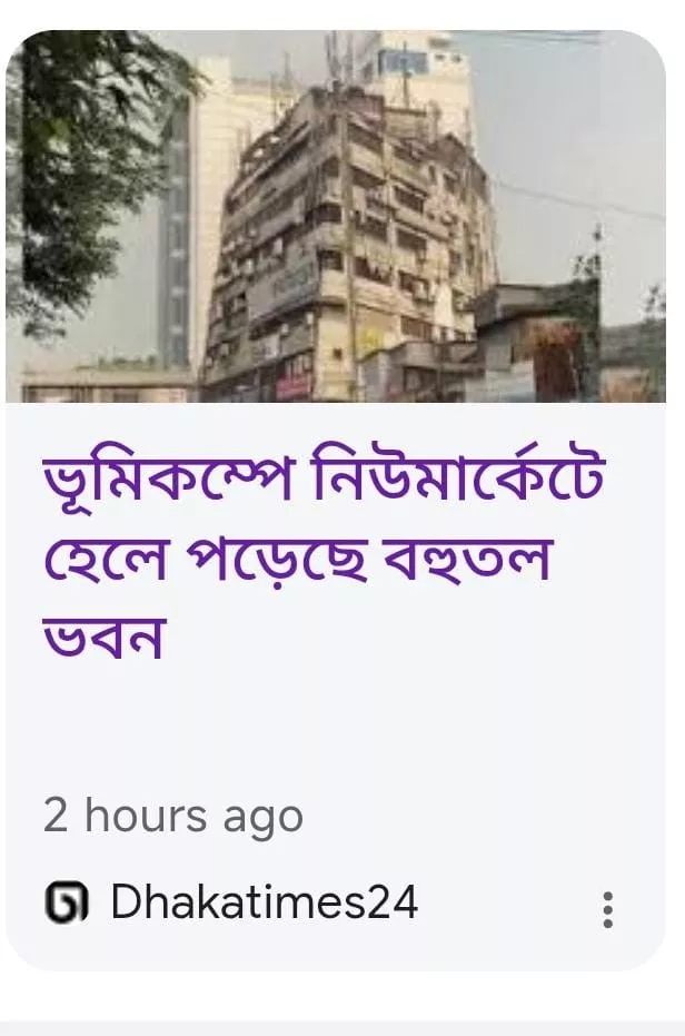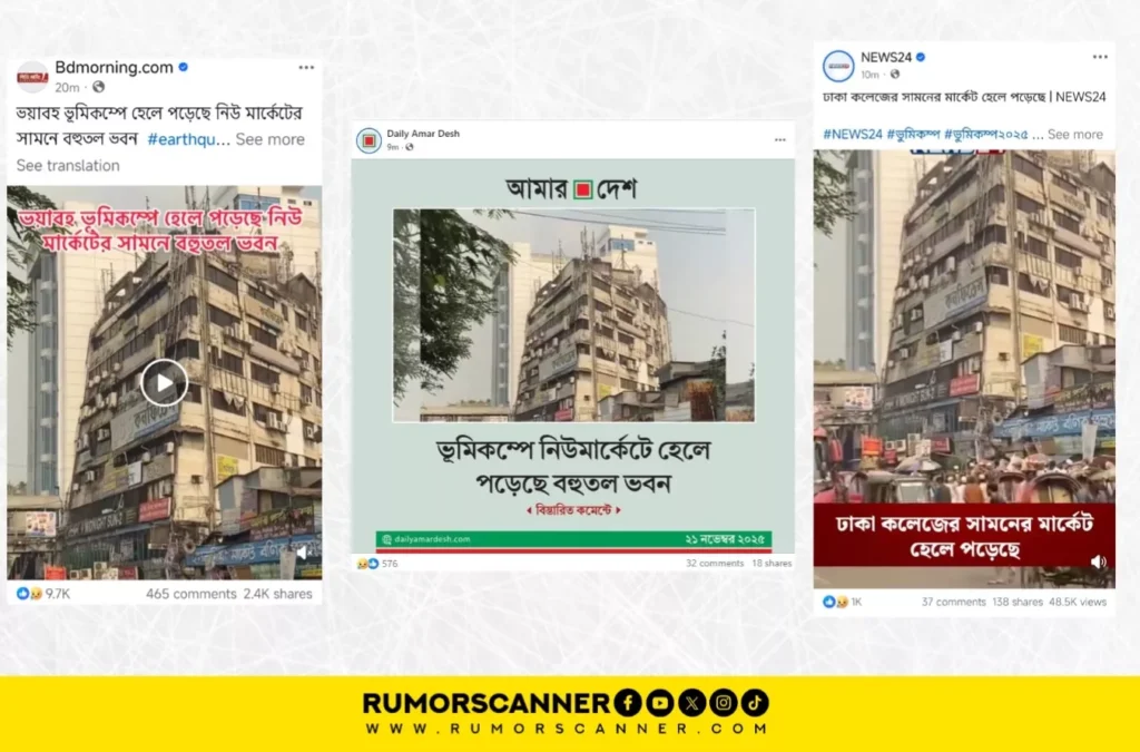 ২১ নভেম্বর সকাল ১০টা ৩৮ মিনিটে দেশের বিভিন্ন স্থানে ভূমিকম্প অনুভূত হয়েছে। আবহাওয়া অধিদপ্তরের তথ্য অনুযায়ী, রিখটার স্কেলে এর মাত্রা ছিল ৫ দশমিক ৭। এরই প্রেক্ষিতে গণমাধ্যমে একটি ভিডিও ফুটেজ প্রচার করে দাবি করা হচ্ছে, ভূমিকম্পে হেলে পড়েছে ঢাকার নিউমার্কেটের একটি ভবন।