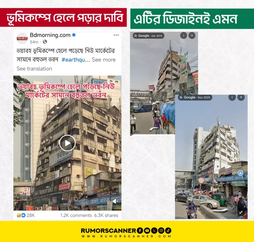 রিউমর স্ক্যানার টিমের অনুসন্ধানে জানা যায়, ঢাকার নিউমার্কেটে রাফিন প্লাজা নামের আলোচিত ভবনটি গতকালের ভূমিকম্পে হেলে পড়ার কোনো ঘটনা ঘটেনি বরং, এই ভবনটির ডিজাইনই এমন।