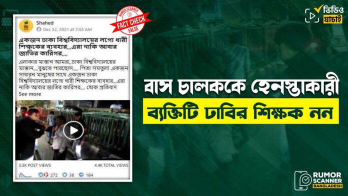 সুতরাং, ব্যক্তিগত গাড়িতে বাস ধাক্কা দেওয়ার অভিযোগে বাস চালককে হেনস্তাকারী এক ব্যক্তিকে ঢাকা বিশ্ববিদ্যালয়ের শিক্ষক দাবিতে সামাজিক যোগাযোগ মাধ্যমে চার বছর পুরোনো একটি ভিডিও পুনরায় প্রচার করা হচ্ছে; যা সম্পূর্ণ মিথ্যা।
