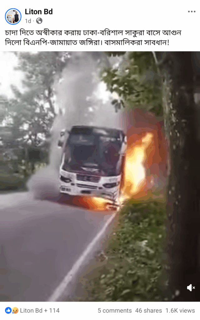 একই ভিডিওটি জামায়াতে ইসলামী ও ইসলামী ছাত্রশিবিরের নেতাকর্মীদের চাঁদা না দেওয়ায় তারা বাসটিতে আগুন দিয়েছে দাবিতেও সামাজিক যোগাযোগ মাধ্যম ফেসবুকে প্রচার করা হয়েছে।