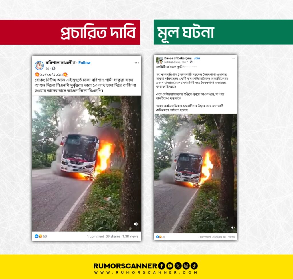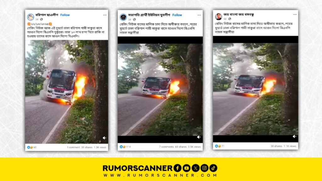 রিউমর স্ক্যানার টিমের অনুসন্ধানে দেখা যায়, আলোচিত ভিডিওটি চাঁদা না দেওয়ার কারণে কোনো বাসে অগ্নিসংযোগের নয়। প্রকৃতপক্ষে, গত ৬ অক্টোবর সাকুরা পরিবহনের একটি বাসের সঙ্গে একটি মোটরসাইকেলের মুখোমুখি সংঘর্ষের পর বাসটিতে আগুন লেগে যায়। ওই ঘটনার ভিডিও ব্যবহার করেই বিএনপি ও জামায়াত-শিবিরের নেতাকর্মীদের জড়িয়ে ভুয়া দাবি ছড়ানো হচ্ছে।