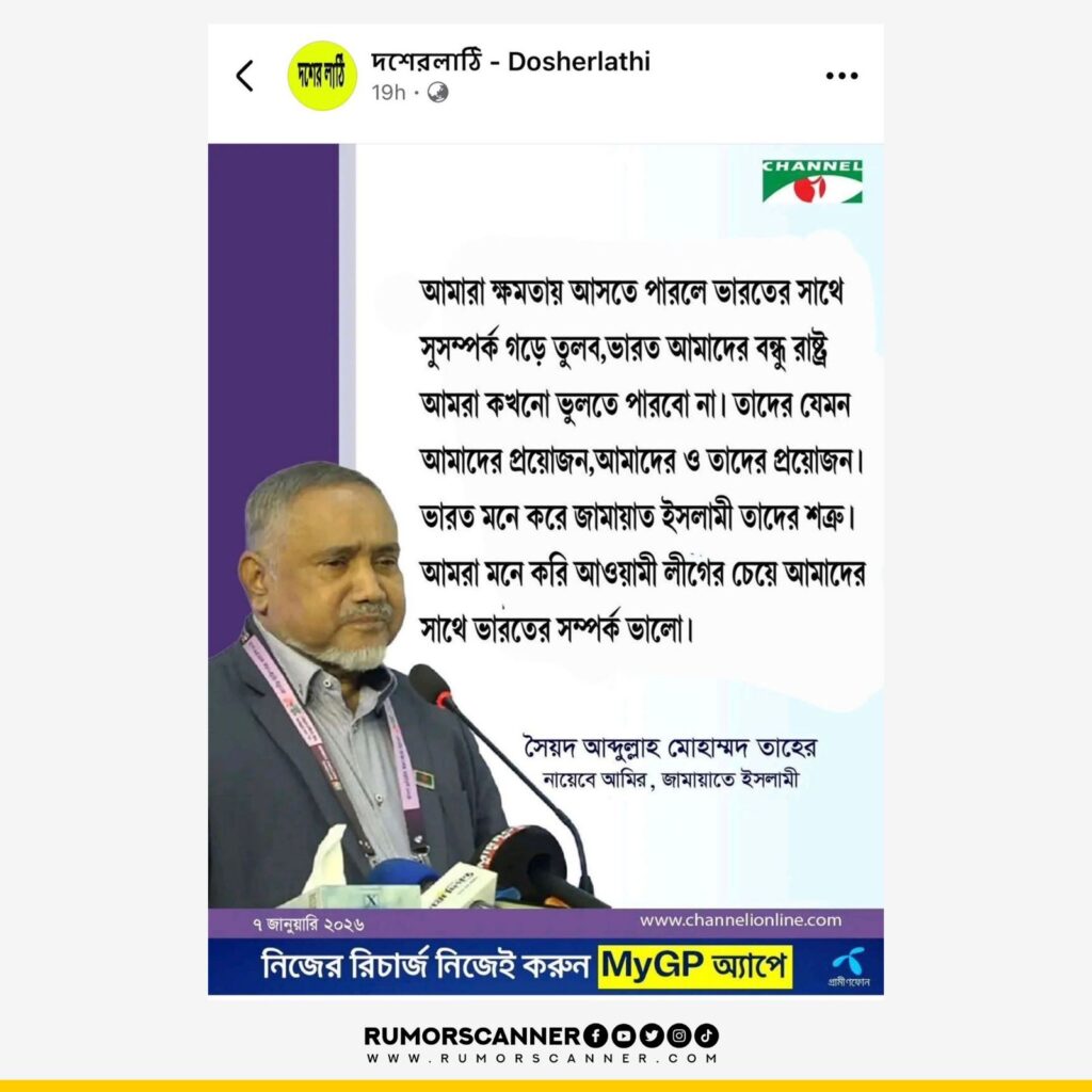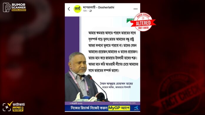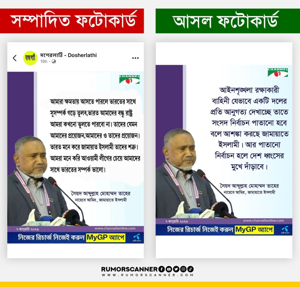 রিউমর স্ক্যানার টিমের অনুসন্ধানে জানা যায়, ভারতের সাথে জামায়াতের সম্পর্ক নিয়ে মোহাম্মদ তাহের এমন কোনো মন্তব্য দেননি এবং চ্যানেল আইও এরূপ কোনো ফটোকার্ড প্রকাশ করেনি। প্রকৃতপক্ষে, ডিজিটাল প্রযুক্তির সহায়তায় চ্যানেল আই কর্তৃক প্রকাশিত ভিন্ন একটি ফটোকার্ড সম্পাদনা করে এই ফটোকার্ডটি তৈরি করা হয়েছে।