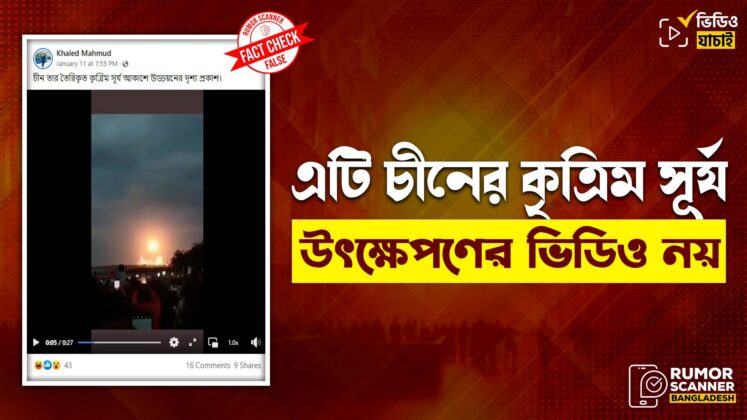 সম্প্রতি, “চীন তার তৈরিকৃত কৃত্রিম সূর্য আকাশে উড্ডয়নের দৃশ্য প্রকাশ।” শীর্ষক শিরোনামে একটি ভিডিও সামাজিক যোগাযোগ মাধ্যমগুলোতে ছড়িয়ে পড়েছে। ফেসবুকে প্রচারিত এমন কিছু পোস্ট দেখুন এখানে, এখানে এবং এখানে। ফ্যাক্টচেক রিউমর স্ক্যানার টিমের অনুসন্ধানে জানা যায়, আলোচিত ভিডিওটি চীনের কৃত্রিম সূর্য উৎক্ষেপণ করার নয় বরং এটি চীনের লংলাউ শহরের ওয়েনচাং উপগ্রহ কেন্দ্র হতে রকেট উৎক্ষেপণের সময়ে নিকটবর্তী … পড়তে থাকুন এটি চীনের কৃত্রিম সূর্য উৎক্ষেপণের ভিডিও নয়