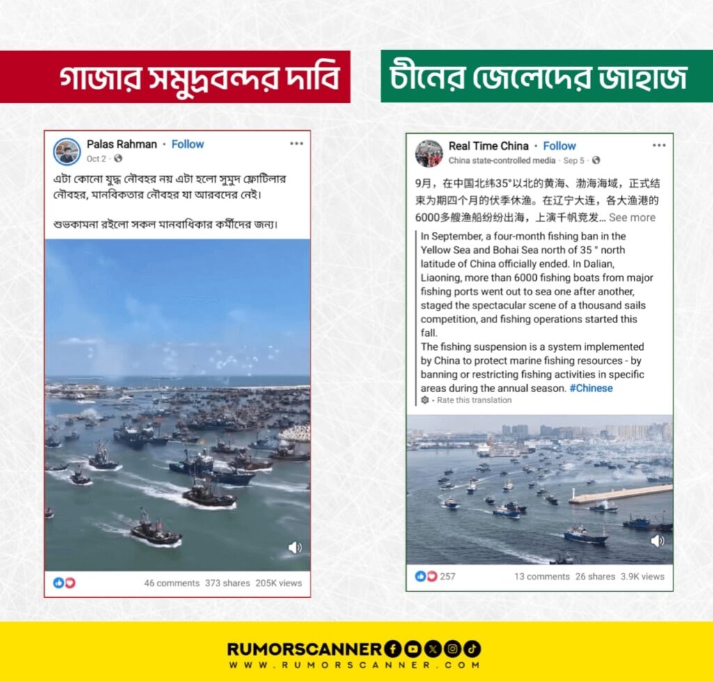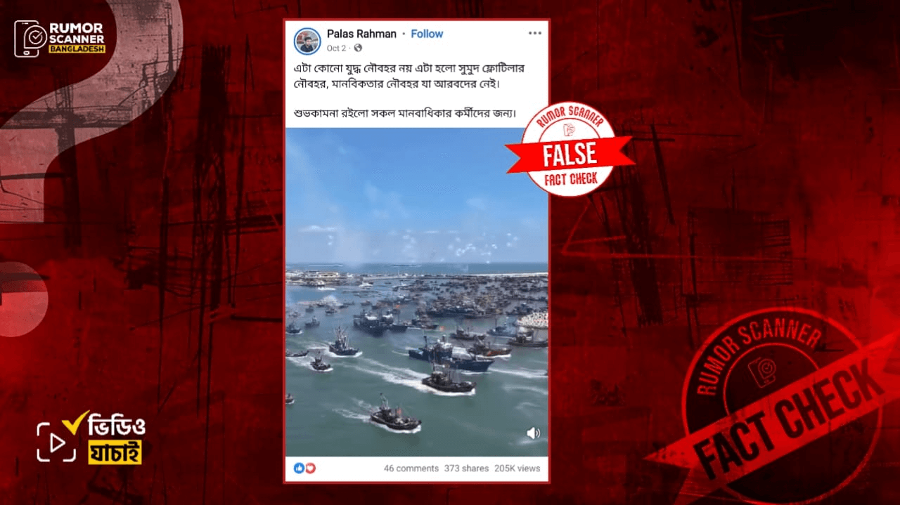রিউমর স্ক্যানার টিমের অনুসন্ধানে জানা যায়, আলোচিত ভিডিওটি গ্লোবাল সুমুদ ফ্লোটিলার নয় বরং, দক্ষিণ চীনের বিভিন্ন বন্দরে জেলেদের মাছ ধরার মৌসুমে সমুদ্রে যাত্রার ভিডিওকে উক্ত দাবিতে প্রচার করা হয়েছে।