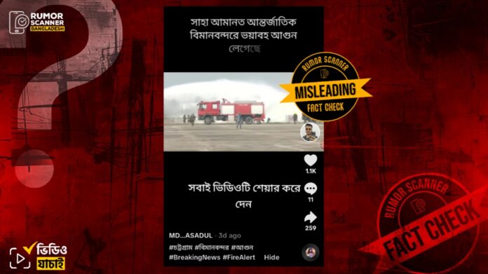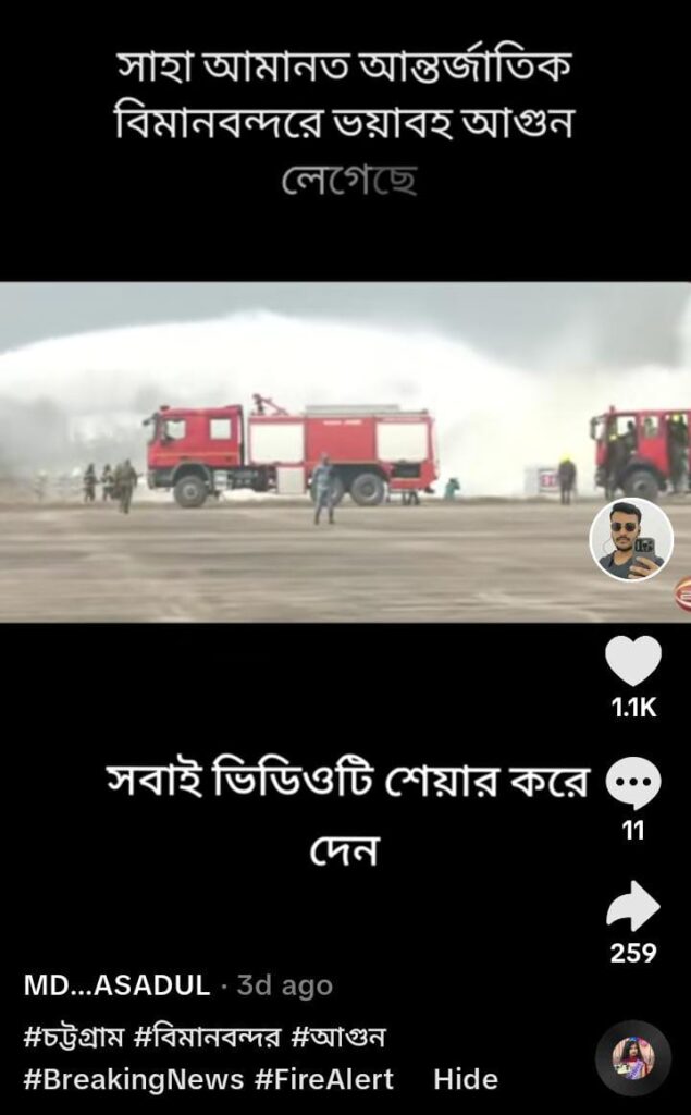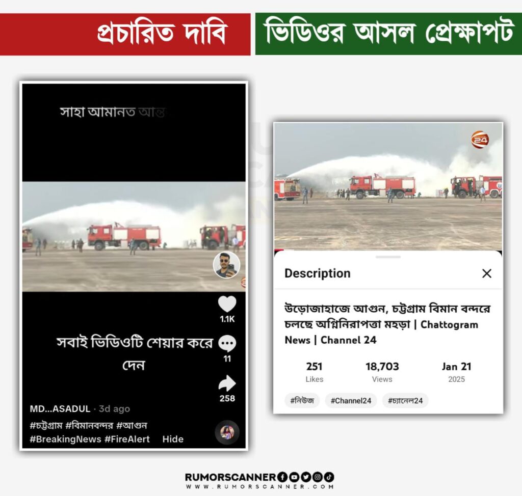 সম্প্রতি অনলাইনে একটি ভিডিও প্রচার করে দাবি করা হয়েছে, ভিডিওটি চট্টগ্রাম শাহ আমানত আন্তর্জাতিক বিমানবন্দরে অগ্নিকাণ্ডের দৃশ্যের।