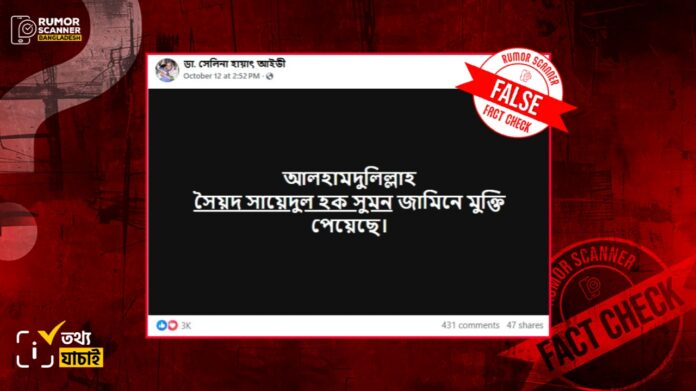 সুতরাং, হবিগঞ্জ-৪ আসনের সাবেক সংসদ সদস্য ব্যারিস্টার সৈয়দ সায়েদুল হক সুমনের জামিন পাওয়ার দাবিটি সম্পূর্ণ মিথ্যা।