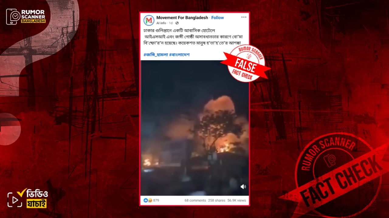 রিউমর স্ক্যানার টিমের অনুসন্ধানে জানা যায়, প্রচারিত ভিডিওটি গুলিস্তানের আবাসিক হোটেলে বোমা হামলার কোনো দৃশ্য নয়। প্রকৃতপক্ষে, গত ২১ ফেব্রুয়ারি সন্ধ্যায় রাজধানীর খিলগাঁওয়ের তালতলা মার্কেটের পাশের স’ মিলে আগুন লাগে। সেই ঘটনার দৃশ্য এটি।