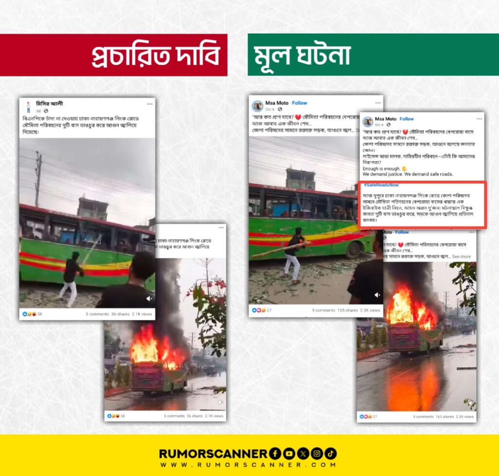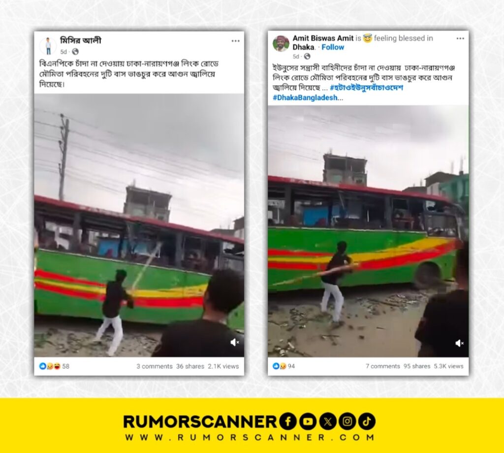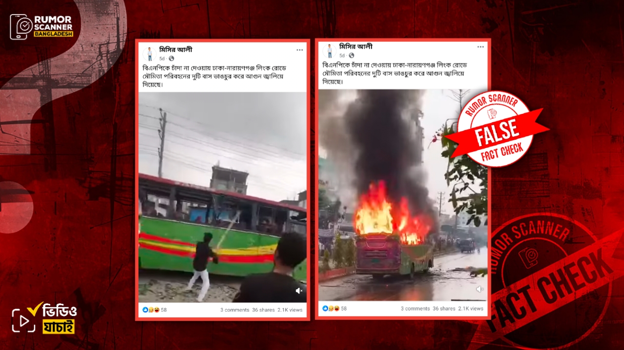 রিউমর স্ক্যানার টিমের অনুসন্ধানে দেখা যায়, চাঁদা না দেওয়ায় বিএনপির নেতাকর্মীদের মৌমিতা পরিবহনের বাস ভাঙচুর করে তাতে অগ্নিসংযোগ করার দাবিতে প্রচারিত তথ্যটি সত্য নয়। প্রকৃতপক্ষে, উক্ত পরিবহনের বাসের ধাক্কায় একজন ব্যক্তি নিহত হওয়ার ঘটনায় বিক্ষুব্ধ জনতা গাড়িটি ভাঙচুর করে তাতে অগ্নিসংযোগ করে। সেই ঘটনার ভিডিওকে আলোচিত দাবিতে প্রচার করা হয়েছে।