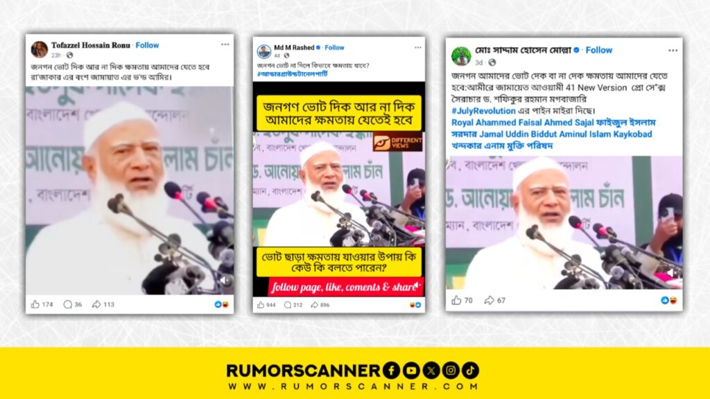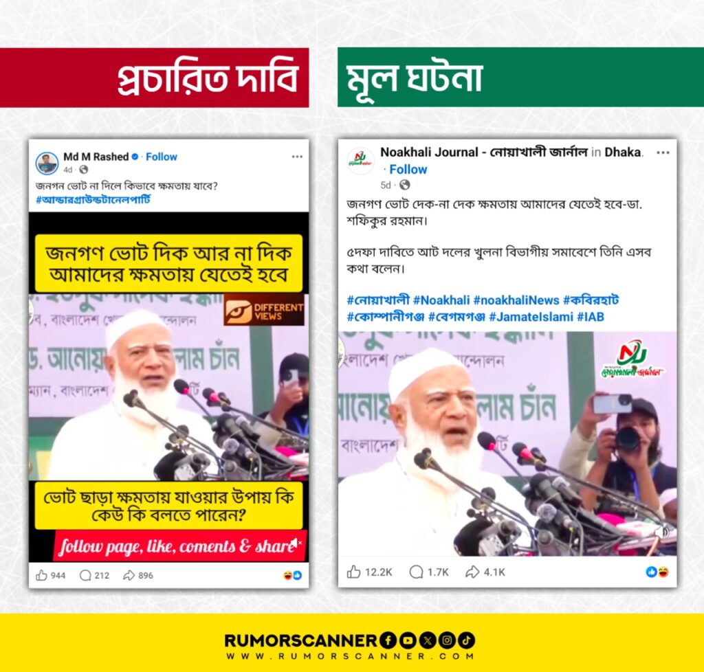 পরবর্তীতে বাংলাদেশ জামায়াতে ইসলামীর ইউটিউব চ্যানেলেও একই অনুষ্ঠানে দলটির আমির ডা. শফিকুর রহমানের বক্তব্যের ভিডিওটি খুঁজে পাওয়া যায়। ভিডিওটিতেও তাকে একই কথাগুলো বলতে শোনা যায়। পাশাপাশি জানা যায়, ভিডিওটি গত ১ ডিসেম্বর খুলনার বাবরী চত্বরে জুলাই জাতীয় সনদ বাস্তবায়ন ও জাতীয় নির্বাচনের আগে গণভোট আয়োজনসহ পাঁচ দফা দাবিতে আটটি রাজনৈতিক দলের সমন্বয়ে গঠিত জোট বিভাগীয় সমাবেশে তার বক্তব্য প্রদানের ঘটনার।