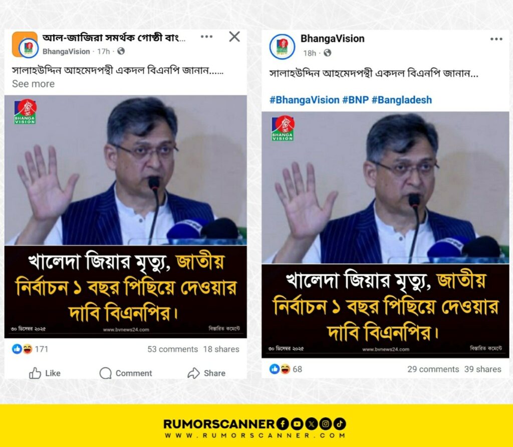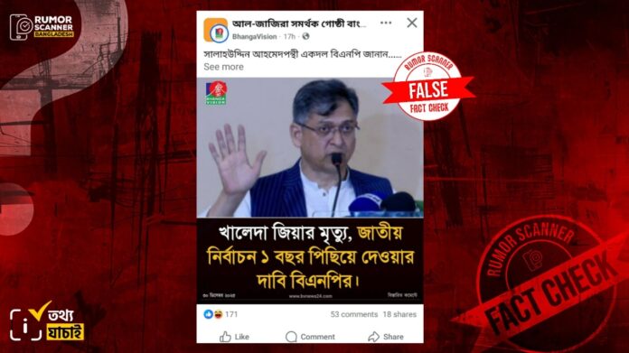 সম্প্রতি সামাজিক যোগাযোগমাধ্যমে একটি ফটোকার্ড প্রচার করা হয়, যেখানে বিএনপির জাতীয় স্থায়ী কমিটির সদস্য সালাহউদ্দিন আহমেদের ছবি সংযুক্ত করে একটি ফটোকার্ড প্রচার করে দাবি করা হয়, খালেদা জিয়ার মৃত্যুতে জাতীয় নির্বাচন এক বছর পিছিয়ে দেওয়ার দাবি জানিয়েছে বিএনপি। ফটোকার্ডটির ক্যাপশনে লেখা, ‘সালাহউদ্দিন আহমেদপন্থী একদল বিএনপি জানান।’