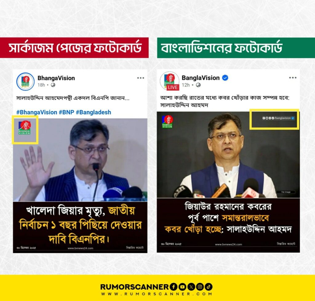 পরবর্তী অনুসন্ধানে BhangaVision নামে একটি ফেসবুক পেজে একই ফটোকার্ডের সন্ধান পাওয়া যায়, যা দাবিটির মূল উৎস। উক্ত পেজে প্রকাশিত ফটোকার্ডগুলোর ডিজাইন বাংলাভিশনের ফটোকার্ডের আদলে তৈরি হলেও ক্ষুদ্র লোগোর ক্ষেত্রে ‘Bangla’ শব্দের পরিবর্তে ‘Bhanga’ লেখা রয়েছে। যা আপাতদৃষ্টিতে দর্শককে বিভ্রান্ত করতে পারে।