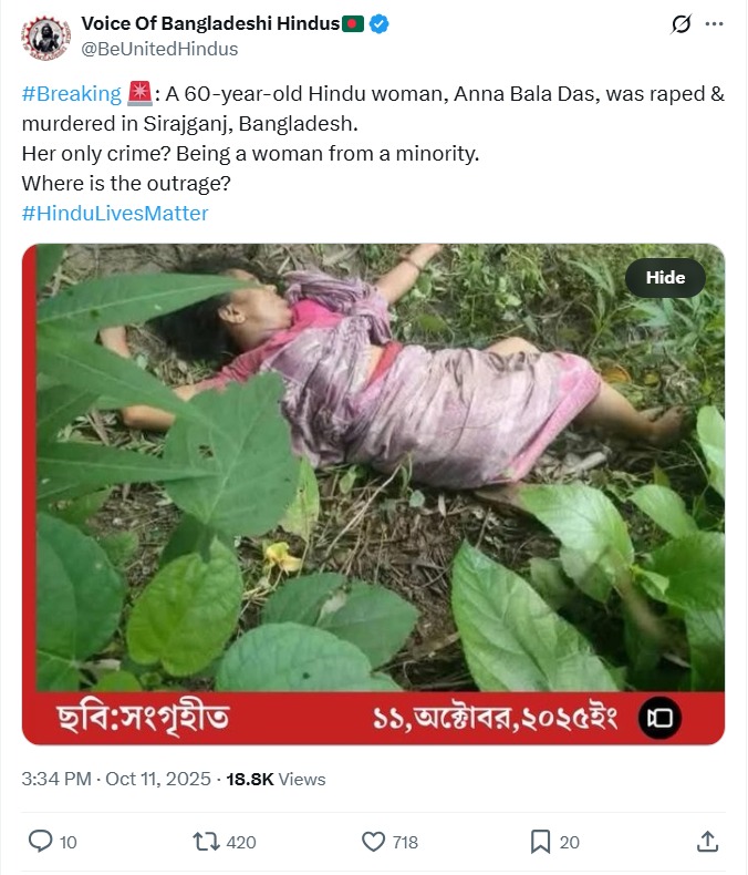 উক্ত ঘটনাকে ‘A 60-year-old Hindu woman, Anna Bala Das, was raped & murdered in Sirajganj, Bangladesh. Her only crime? Being a woman from a minority. Where is the outrage?’ অর্থাৎ, ‘বাংলাদেশের সিরাজগঞ্জে ৬০ বছর বয়সী হিন্দু নারী আন্না বালা দাসকে ধর্ষণ ও হত্যা করা হয়েছে। তার একমাত্র অপরাধ? সংখ্যালঘু সম্প্রদায়ের একজন নারী হওয়া।’ শীর্ষক দাবিতে সামাজিক যোগাযোগমাধ্যমে প্রচার হতে দেখা যায়।