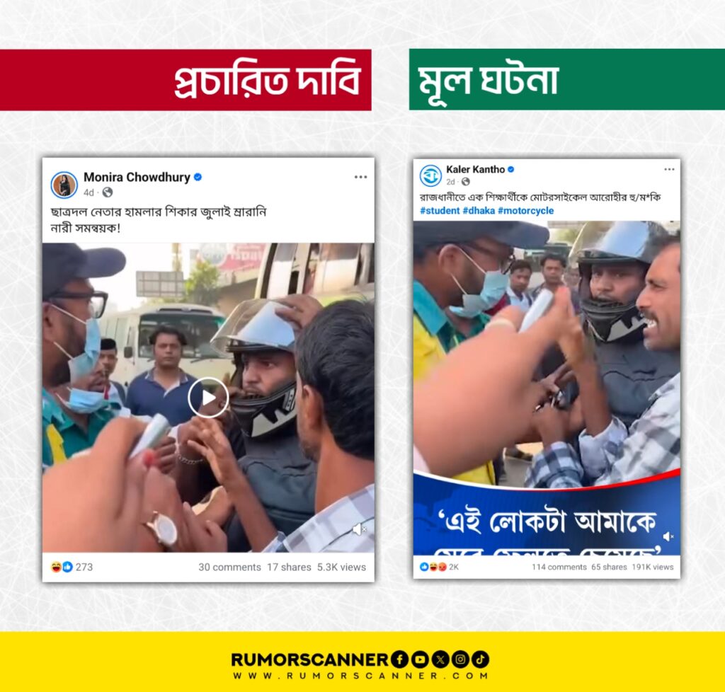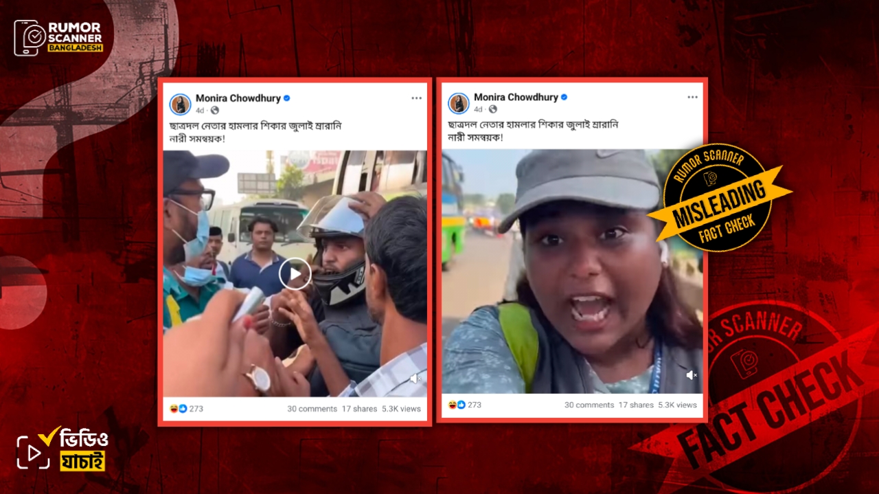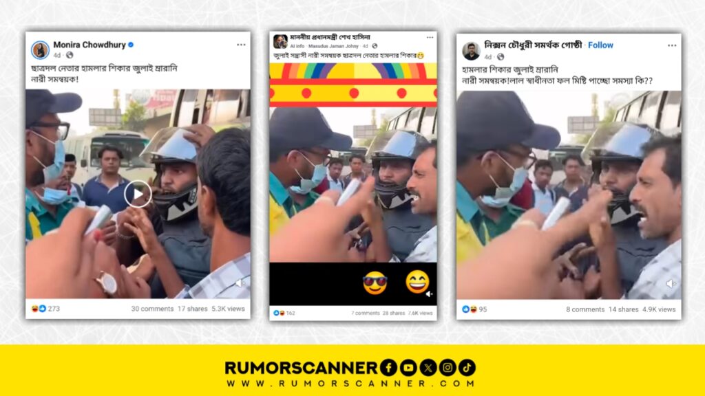 রিউমর স্ক্যানার টিমের অনুসন্ধানে দেখা যায়, ট্রাফিকের দায়িত্ব পালনকারী নারী সমন্বয়কের ওপর ছাত্রদল নেতার হামলার দাবিটি সঠিক নয়। প্রকৃতপক্ষে, ভুক্তভোগী ওই নারী সমন্বয়ক নন এবং অভিযুক্তের রাজনৈতিক সংশ্লিষ্টতার বিষয়েও জানা যায়নি। মূলত, ট্রাফিকের দায়িত্ব পালনকালে ওই নারী রিক্সার চাকার পাম্প ছেড়ে দিলে তা নিয়ে অভিযুক্তের সাথে বাকবিতণ্ডা হয়। পরবর্তীতে অভিযুক্তকে দায়িত্বপ্রাপ্ত সার্জেটের হাতে তুলে দেওয়া হয়। সেই মুহুর্তে ধারণ করা ভিডিওকে আলোচিত দাবিতে প্রচার করা হয়েছে।