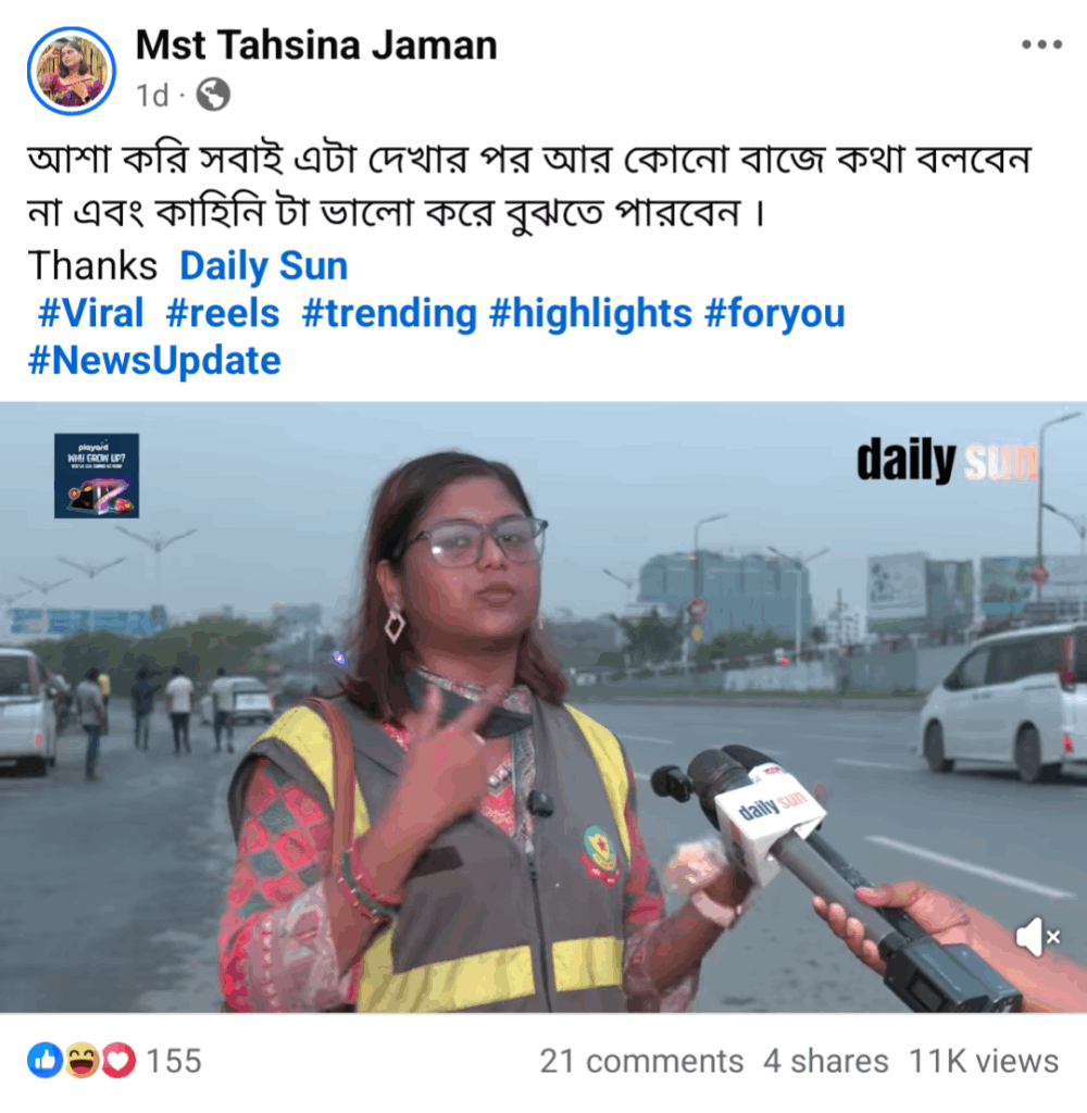 তাহসিনা জামানের ফেসবুক অ্যাকাউন্ট পর্যালোচনা করে পরবর্তীতে তার সেদিনের ঘটনা নিয়ে মূলধারার গণমাধ্যম দ্য ডেইলি সানে প্রকাশিত তার একটি সাক্ষাৎকারও খুঁজে পাওয়া যায়।