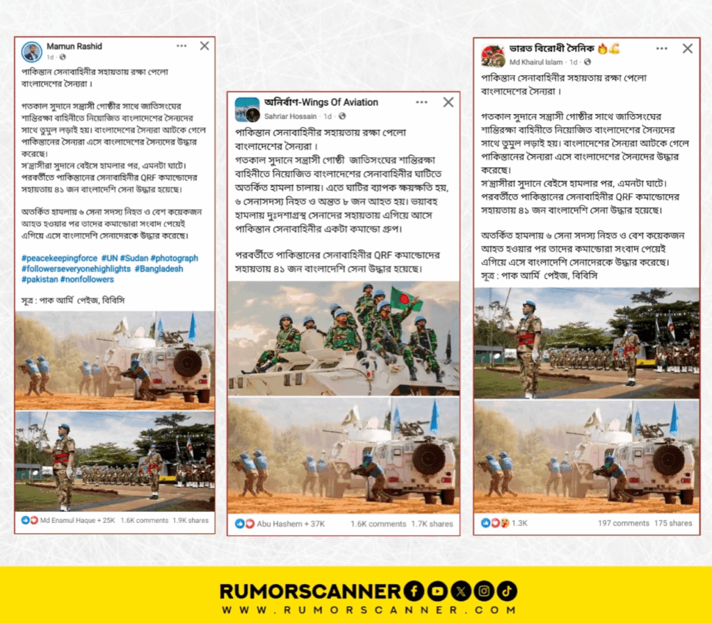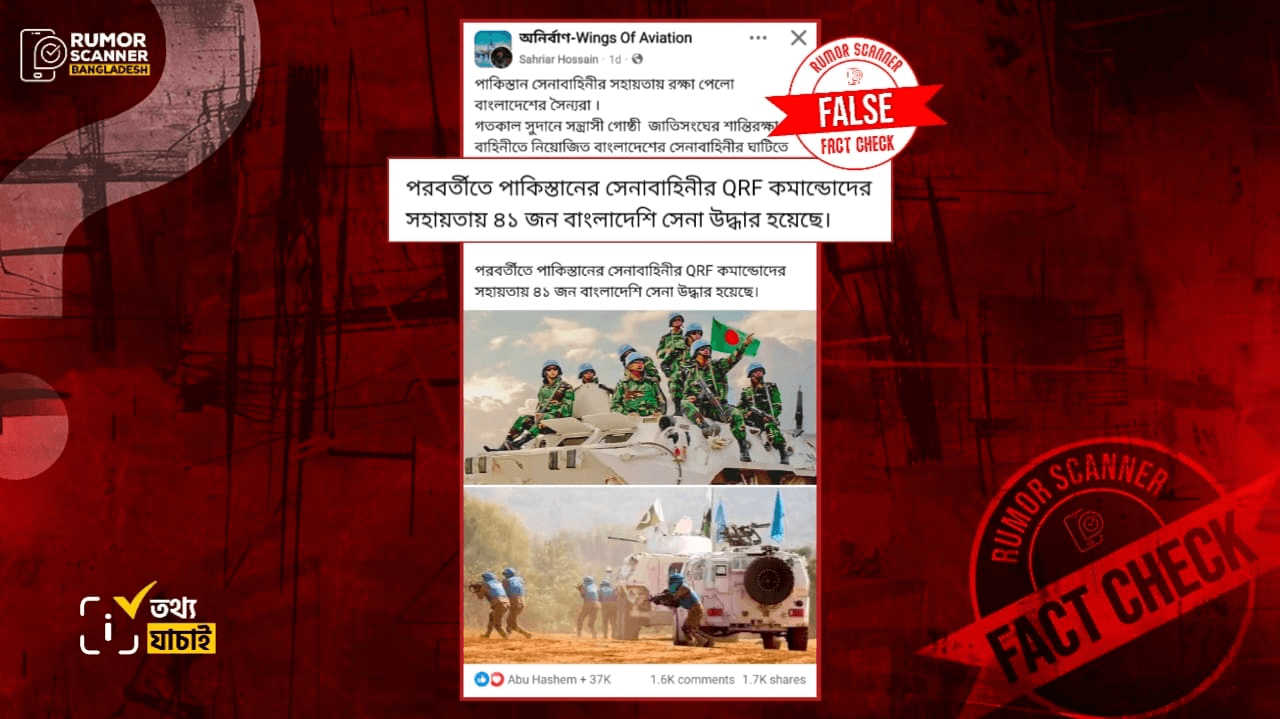 সুদানের খনিজপ্রধান আবেই এলাকায় জাতিসংঘ শান্তি রক্ষা মিশনের ঘাঁটিতে সন্ত্রাসী গোষ্ঠীর হামলায় বাংলাদেশ সেনাবাহিনীর ছয় সেনার মর্মান্তিক মৃত্যু এবং তিন নারী সেনাসহ মোট আটজনের গুরুতর আহত হওয়ার ঘটনা ঘটেছে। এরই প্রেক্ষিতে সুদানে পাকিস্তানি সেনাবাহিনীর সহায়তায় বাংলাদেশ সেনাবাহিনীর ৪১ জন সেনা সদস্যকে উদ্ধার করেছে শীর্ষক একটি দাবি ইন্টারনেটে প্রচার করা হয়েছে।