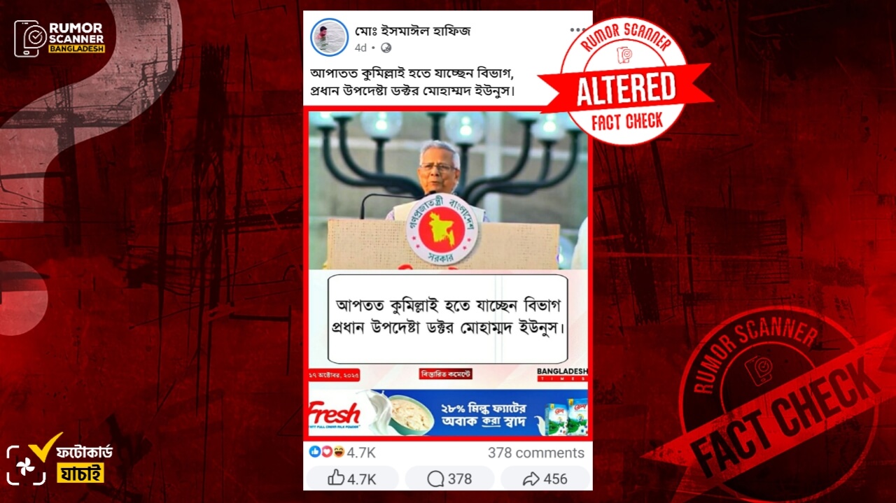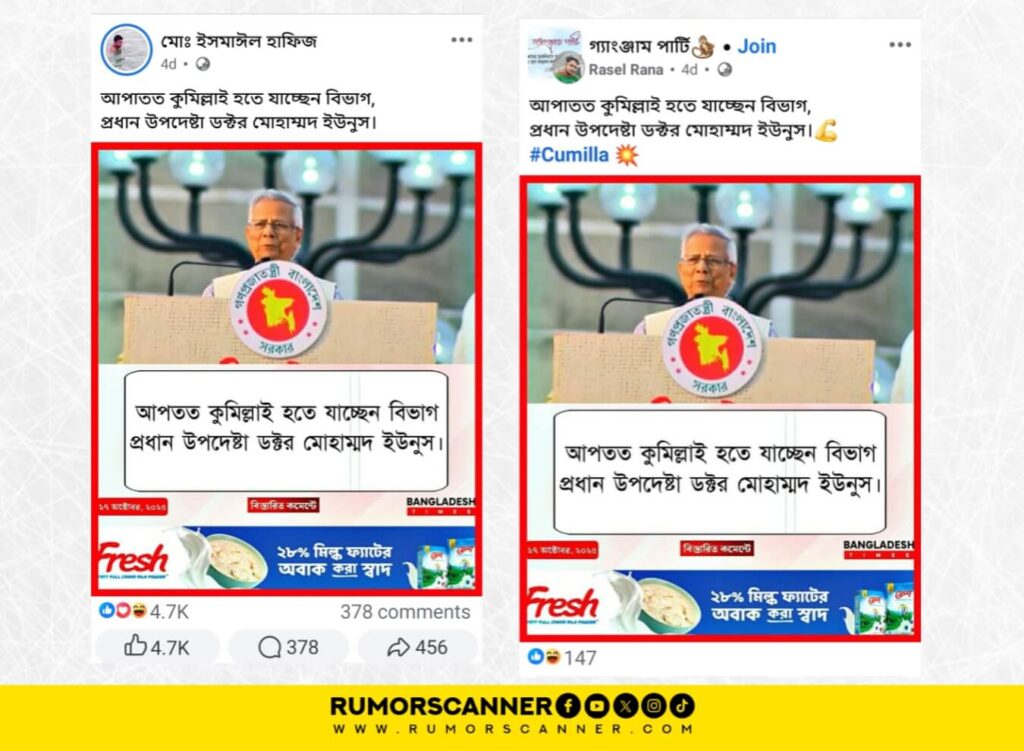 রিউমর স্ক্যানার টিমের অনুসন্ধানে জানা যায়, “আপাতত কুমিল্লাই হতে যাচ্ছেন বিভাগ, প্রধান উপদেষ্টা ডক্টর মোহাম্মদ ইউনুস।” শীর্ষক তথ্যে বা শিরোনামে বাংলাদেশ টাইমস কোনো ফটোকার্ড বা সংবাদ প্রকাশ করেনি বরং, ডিজিটাল প্রযুক্তির সহায়তায় গণমাধ্যমটির ভিন্ন একটি ফটোকার্ড সম্পাদনার মাধ্যমে এই ফটোকার্ডটি তৈরি করা হয়েছে। এছাড়া, ড. ইউনূসও সম্প্রতি এরূপ কোনো প্রকাশ্য মন্তব্য করেননি।