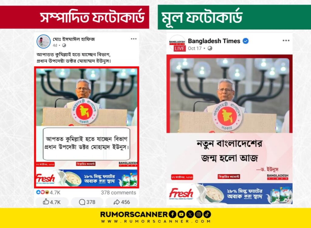 তবে, গত ১৭ অক্টোবরে “নতুন বাংলাদেশের জন্ম হলো আজ” শীর্ষক শিরোনামে বাংলাদেশ টাইমসের ফেসবুক পেজে প্রচারিত একটি ফটোকার্ড খুঁজে পাওয়া যায়। ফটোকার্ডটি পর্যালোচনা করে আলোচিত দাবিতে প্রচারিত ফটোকার্ডের ছবি ও গ্রাফিক্যাল ডিজাইনের সাথে এর সাদৃশ্য খুঁজে পাওয়া যায়। তবে আলোচিত ফটোকার্ডটিতে ‘নতুন বাংলাদেশের জন্ম হলো আজ’ শীর্ষক বাক্যের পরিবর্তে ‘আপাতত কুমিল্লাই হতে যাচ্ছেন বিভাগ, প্রধান উপদেষ্টা ডক্টর মোহাম্মদ ইউনুস।’ শীর্ষক বাক্য লেখা হয়েছে।