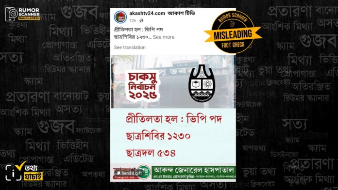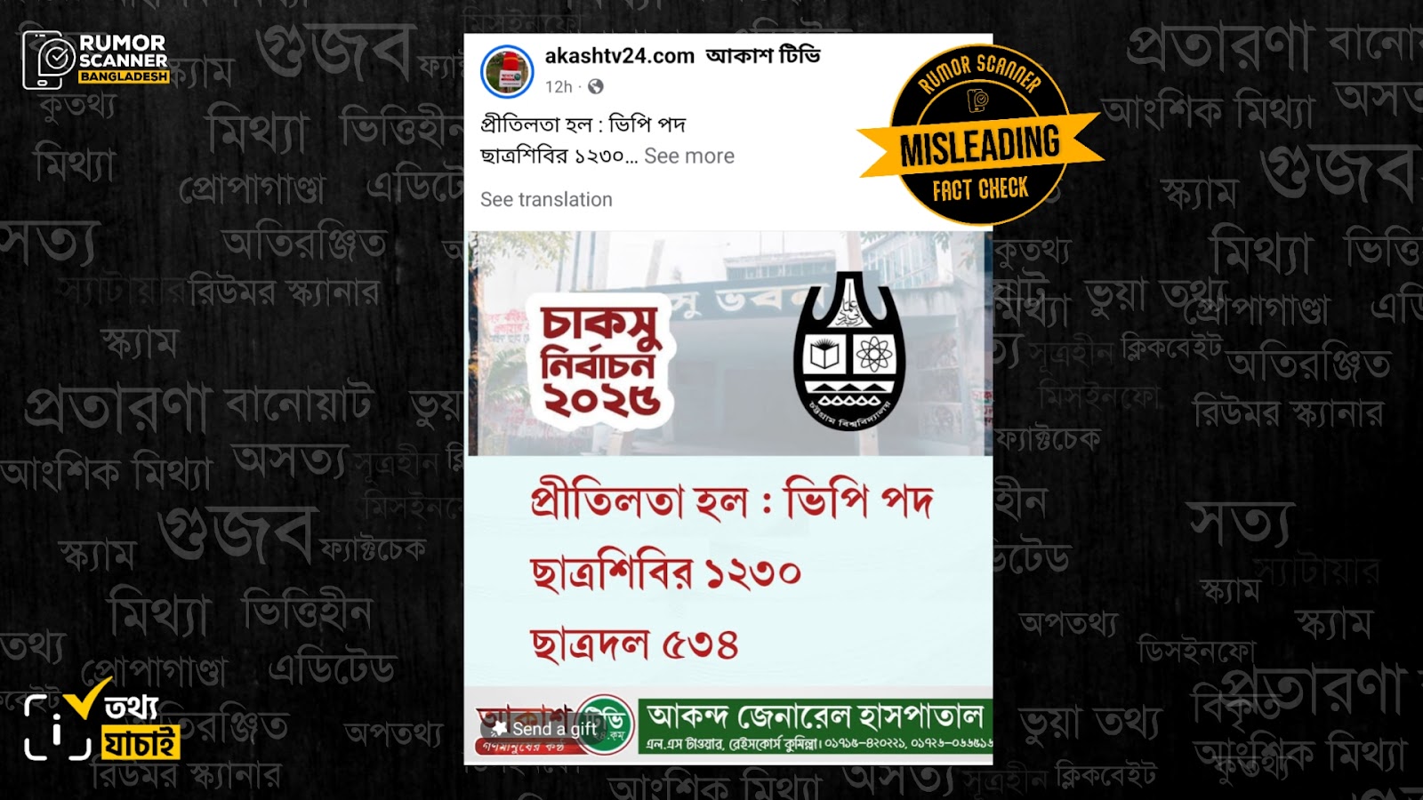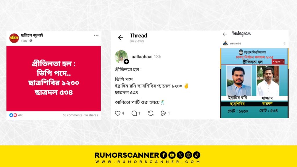 রিউমর স্ক্যানার টিমের অনুসন্ধানে জানা যায়, চাকসু নির্বাচনে প্রীতিলতা হলে মো. ইব্রাহিমের ১২৩০ ও সাজ্জাদের ৫৩৪ ভোট পাওয়ার তথ্যটি সঠিক নয় বরং এই হলে মো. ইব্রাহিম ৫৮১ ও সাজ্জাদ পেয়েছেন ২৮৩ ভোট।