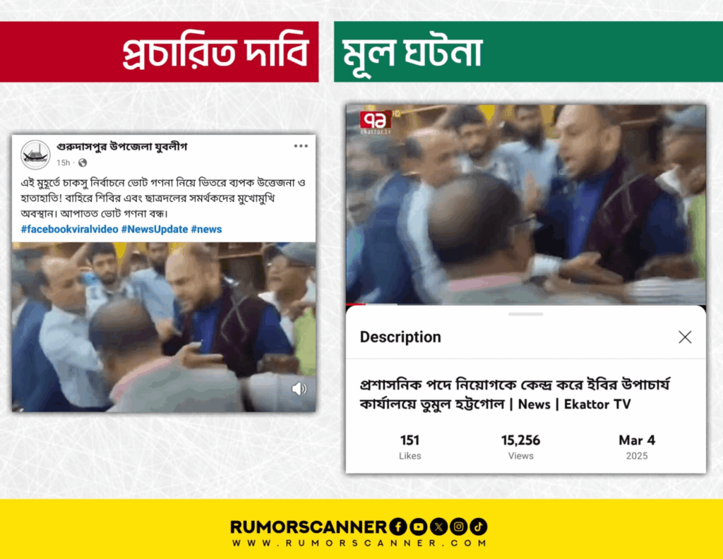 রিউমর স্ক্যানার টিমের অনুসন্ধানে জানা যায়, আলোচিত ভিডিওটি চাকসু নির্বাচনের সঙ্গে সম্পর্কিত নয় এবং ভোট গণনাকে কেন্দ্র করে কোনো হাতাহাতির তথ্যও পাওয়া যায়নি। বরং, ভিডিওটি গত মার্চে কুষ্টিয়ার ইসলামী বিশ্ববিদ্যালয়ে প্রশাসনিক পদে নিয়োগ নিয়ে উপাচার্যের কার্যালয়ে ঘটে যাওয়া হট্টগোলের দৃশ্য।