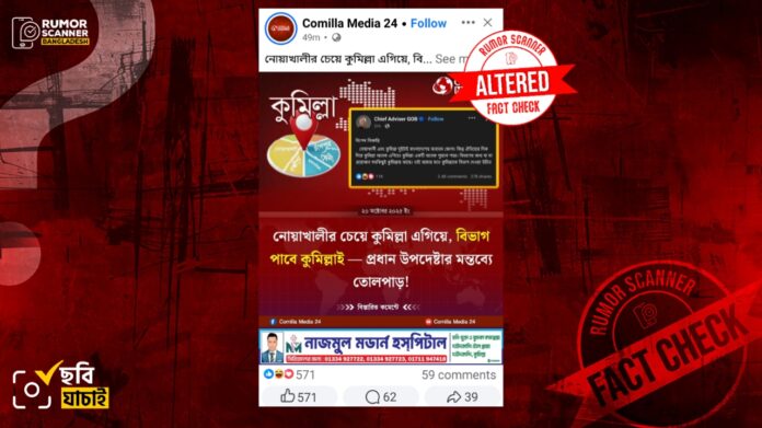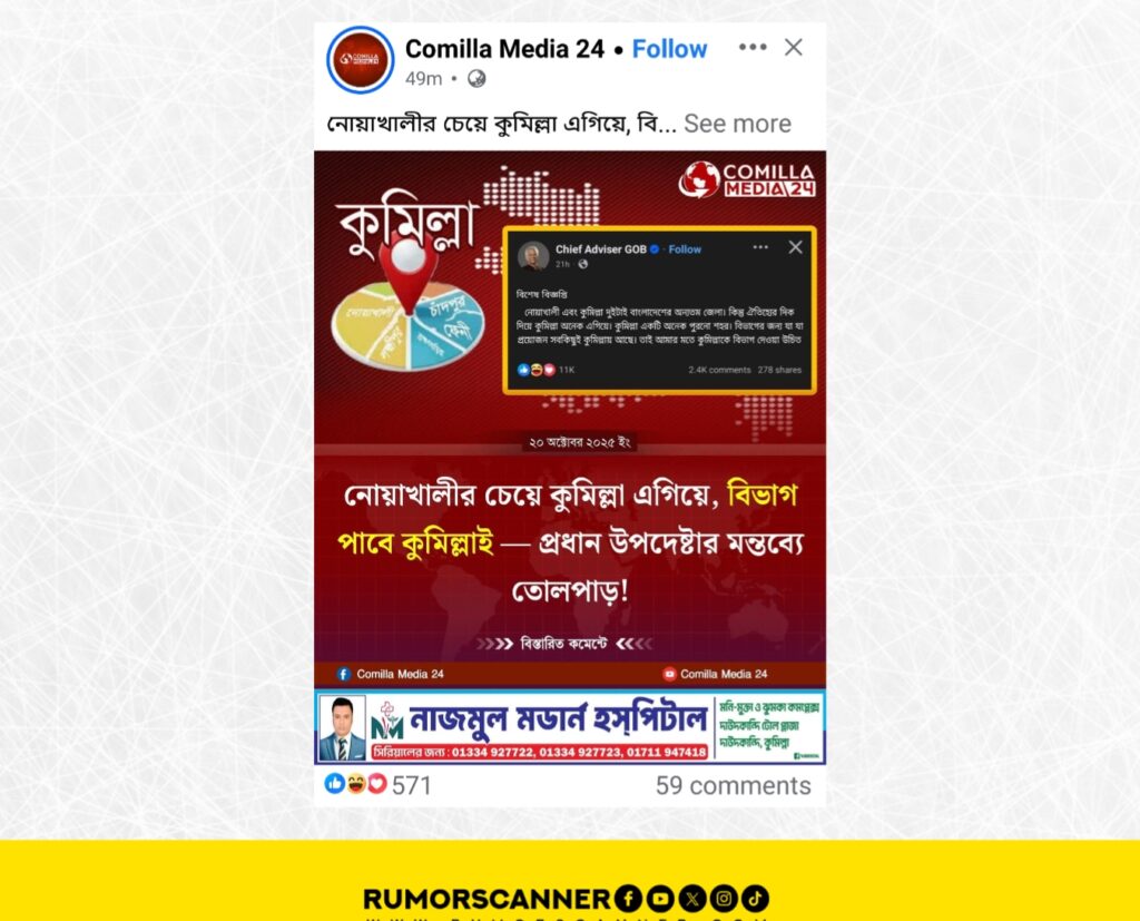 কুমিল্লাকে বিভাগ করার দাবিতে অনেক বছর ধরেই আন্দোলন করে আসছে এ জেলার মানুষেরা। একই দাবিতে সোচ্চার নোয়াখালীর মানুষেরাও। এই জেলার মানুষেরা কুমিল্লার অধীনে বিভাগে অন্তর্ভুক্ত না হয়ে তাদের জেলাকেই বিভাগ ঘোষণার দাবিতে আন্দোলন করে আসছেন। সম্প্রতি বিষয়টি নিয়ে দুই জেলার মানুষই ফের আন্দোলন সভা সমাবেশ করছেন। এরই প্রেক্ষিতে অন্তর্বর্তীকালীন সরকারের প্রধান উপদেষ্টা ড. মুহাম্মদ ইউনূস এ বিষয়ে ফেসবুকে পোস্ট করেছেন দাবিতে একটি স্ক্রিনশট প্রচার হচ্ছে সামাজিক যোগাযোগ মাধ্যমে। কথিত এই স্ক্রিনশটে দেখা যায়, ফেসবুক পোস্টে ড. ইউনূস বলছেন, “নোয়াখালী এবং কুমিল্লা দুইটাই বাংলাদেশের অন্যতম জেলা। কিন্তু ঐতিহ্যের দিক দিয়ে কুমিল্লা অনেক এগিয়ে। কুমিল্লা একটি অনেক পুরনো শহর। বিভাগের জন্য যা যা প্রয়োজন সবকিছুই কুমিল্লায় আছে। তাই আমার মতে কুমিল্লাকে বিভাগ দেওয়া উচিত।”
