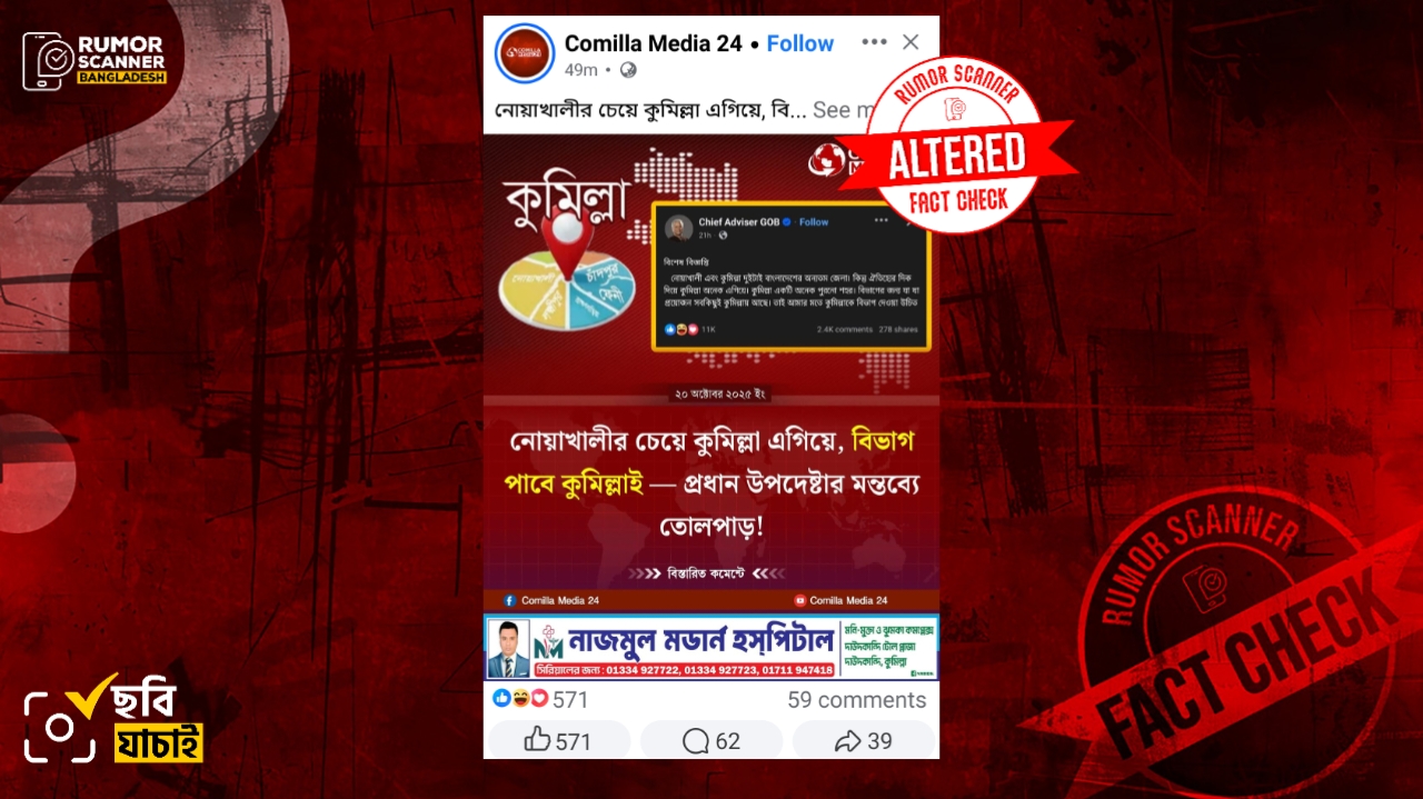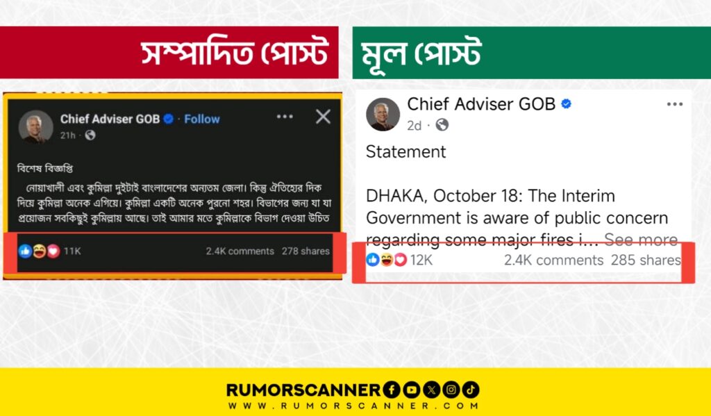 দাবিটির সূত্রপাত অনুসন্ধানে ২০ অক্টোবর রাত ৮ টা ৫৩ মিনিটে Comilla Media 24 নামের একটি ফেসবুক পেজে এ সংক্রান্ত প্রথম পোস্টটি খুঁজে পাওয়া যায়। পোস্টে প্রধান উপদেষ্টার সরকারি ফেসবুক পেজ ‘Chief Adviser GOB’ এর একটি কথিত পোস্টের স্ক্রিনশট প্রচারের প্রেক্ষিতে অনুসন্ধানে পেজটিতে এমন কোনো পোস্ট পাওয়া যায়নি। তবে সূত্রপাত পোস্টে থাকা স্ক্রিনশটে দৃশ্যমান সময় এবং পোস্ট এনগেজমেন্ট বিশ্লেষণ করে কাছাকাছি সময়ে পেজে একটি পোস্ট পাওয়া যায়। দুইটি পোস্টের এনগেজমেন্টে লক্ষ্যণীয় সাদৃশ্য পাওয়া যাচ্ছে। তবে প্রধান উপদেষ্টার এই পোস্টটি বিভাগ সংক্রান্ত ছিল না। ছিল সাম্প্রতিক অগ্নিকাণ্ড বিষয়ে।
