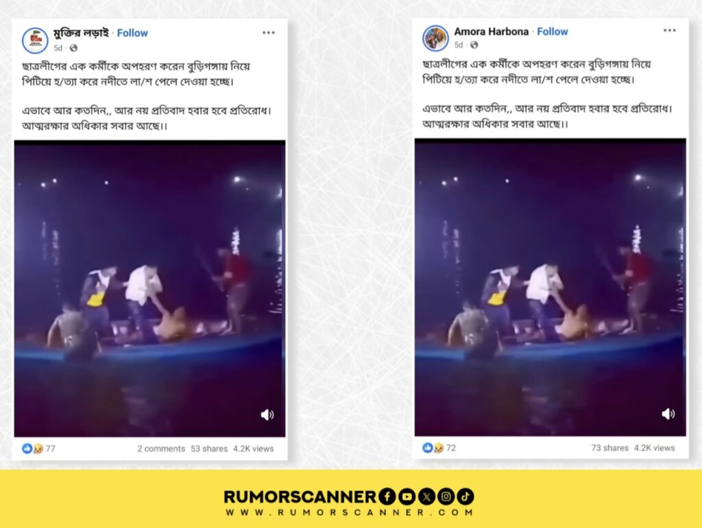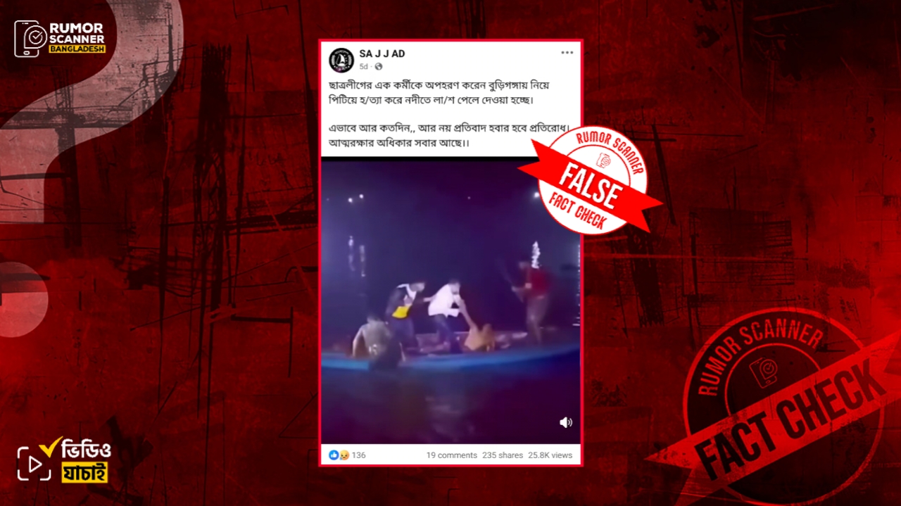 সম্প্রতি, ‘ছাত্রলীগের এক কর্মীকে অপহরণ করেন বুড়িগঙ্গায় নিয়ে পিটিয়ে হত্যা করে নদীতে লাশ ফেলে দেওয়া হচ্ছে’ দাবিতে একটি ভিডিও সামাজিক যোগাযোগমাধ্যমে ছড়িয়ে পড়েছে।